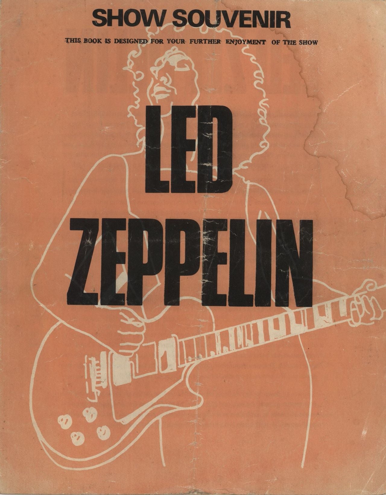 LED ZEPPELIN Show Souvenir (Rare 1972 UK 12-page unofficial programme for their Winter 72/73 UK tour with biography info, pictures, covers for Zep III & IV & a reprint of an original Atlantic press release, plus UK tour dates (excluding Preston Guild Hall) printed inside the back cover. These unofficial programmes were produced in far fewer numbers than the official ones & the sellers also had to run the gauntlet of Messrs Grant & Cole ... This copy has been through the rock & rollmill and shows it with stainig to the top right corner running through all pages and a deep crease through the middle with all pages remarkably still secure)