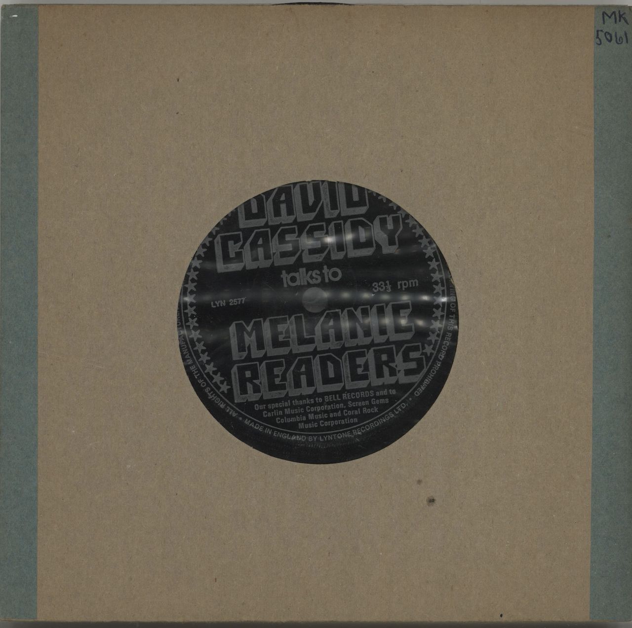 DAVID CASSIDY David Cassidy Talks To Melanie Readers (1973 UK single sided flexidisc, originally issued with copies of Melanie magazine, featuring David giving a message to his UK fanbase, interspersed with excerpts from Two Time Loser, LookingThrough The Eyes Of Love, Could It Be Forever & Keep On Smiling LYN2577)