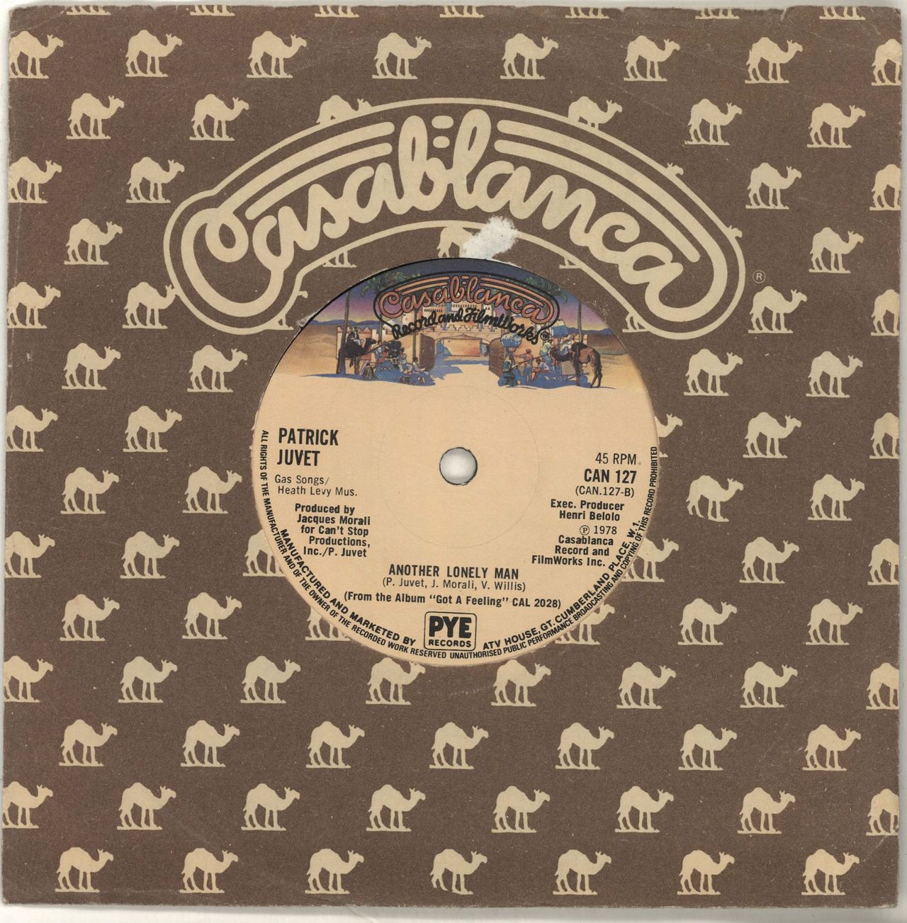 PATRICK JUVET Another Lonely Man (1978 UK solid centre 7" vinyl single, also including Got A Feeling. Issued in a Casablanca die-cut paper sleeve which shows a little shelfwear, the vinyl remains in excellent condition CAN127)