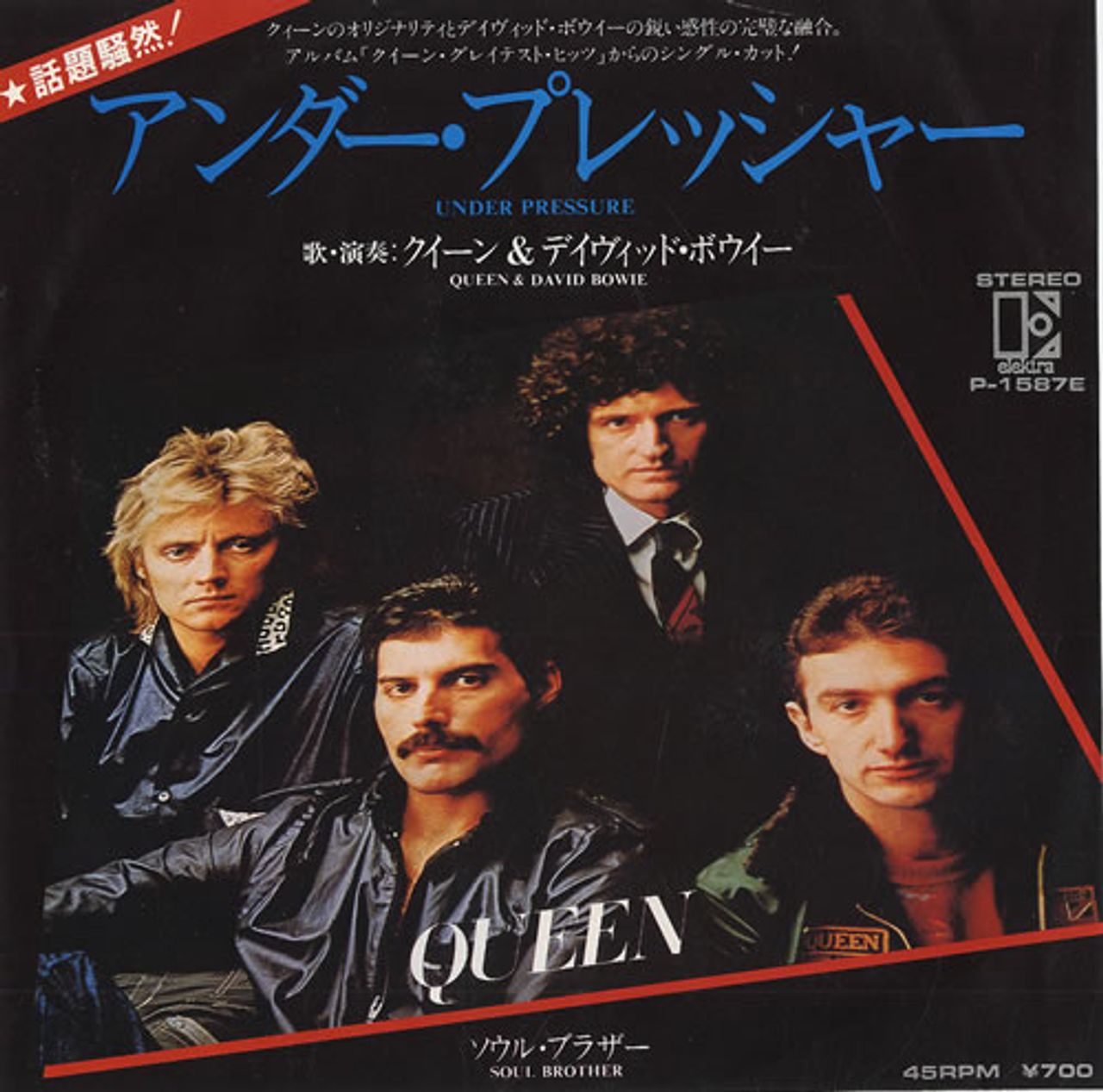 QUEEN & DAVID BOWIE Under Pressure (1981 Japanese wide-centred 7" vinyl single, also including Soul Brother, unique Japanese blue titled group picture insert with lyrics on the reverse. The insert has very light signs of age wear and the vinylhas minimal signs of play P-1587E)