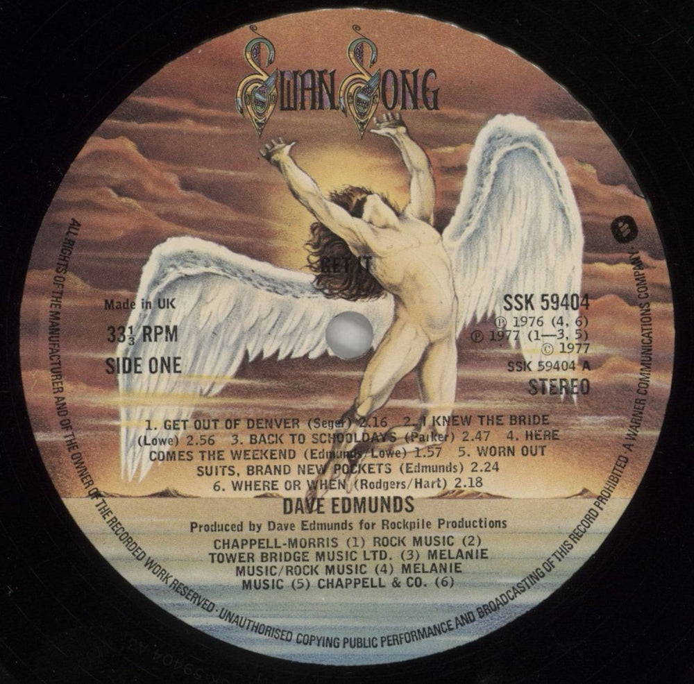 DAVE EDMUNDS Get It (1977 UK 13-track LP on Led Zeppelin's Swan Song label, featuring the hit single I Knew The Bride, with guest appearances from Rockpile cohorts Nick Lowe & Terry Williams, alongside Bob Andrews & Steve Goulding from The Rumour & ex-Brinsley Schwarz drummer, Billy Rankin, picture sleeve. The sleeve shows just a little light shelfwear & the vinyl is Excellent condition with few signs of visible play SSK59404)