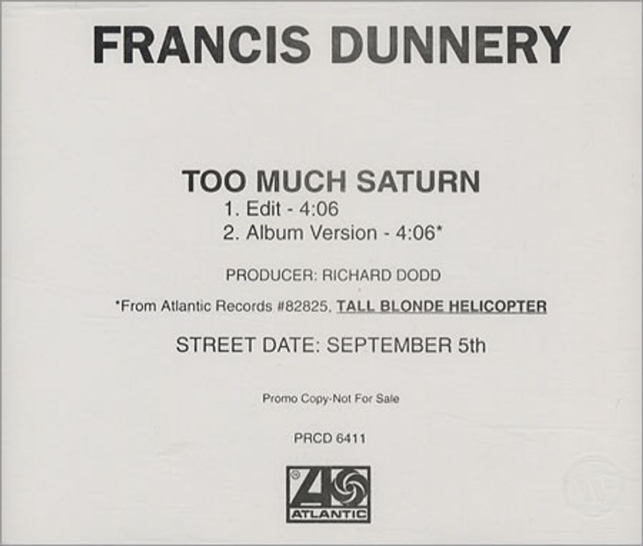 FRANCIS DUNNERY Too Much Saturn (1996 US 2-track promotional