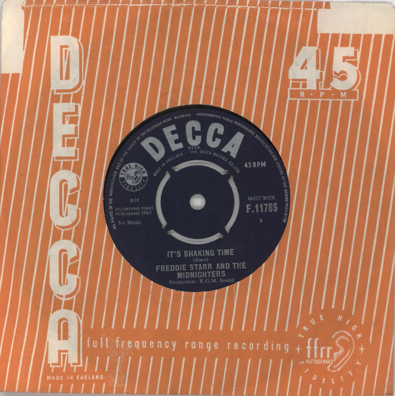 FREDDIE STARR & THE MIDNIGHTERS It's Shaking Time (British R&B/Mod Beat 1963 UK 7" single on Decca with four-prong centre, produced & written by Joe Meek & starring a young Keith Hartley. Also features the b-side 'Baby Blue' credited to Meek,die-cut company sleeve. The vinyl is clean & in Excellent condition with very little play [plus no hamsters were hurt during the making of this 45 [allegedly]] F.11786)