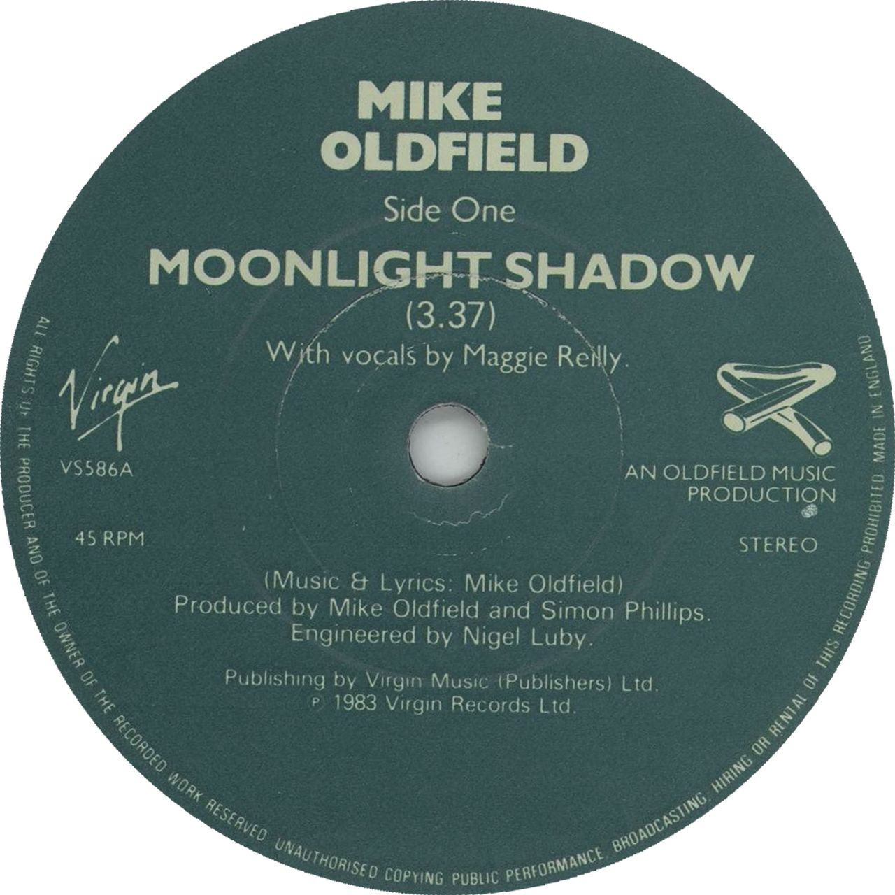 MIKE OLDFIELD Moonlight Shadow (1983 UK solid centre 7" vinyl single of the international radio hit featuring vocals by Maggie Reilly, also including Rite Of Man. Housed in a plain black die-cut sleeve VS586)