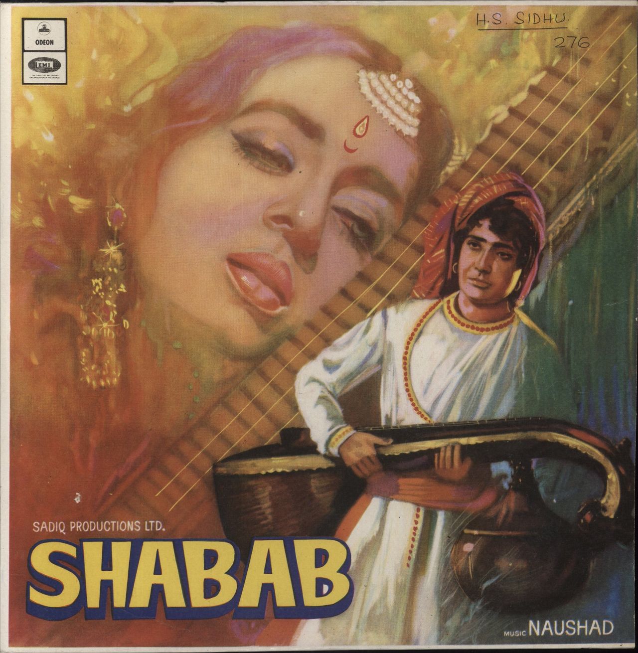 NAUSHAD Shabab (1973 Indian 12-track vinyl LP on the black & silver Odeon label, Naushad's movie score featuring performances by Hemant Kumar, Lata Mangeshkar and Mohd.Rafi, pasted picture sleeve. The sleeve has a name annotation to the front,whilst despite annotations to the labels, the vinyl is Excellent with little sign of play MOCE4181)