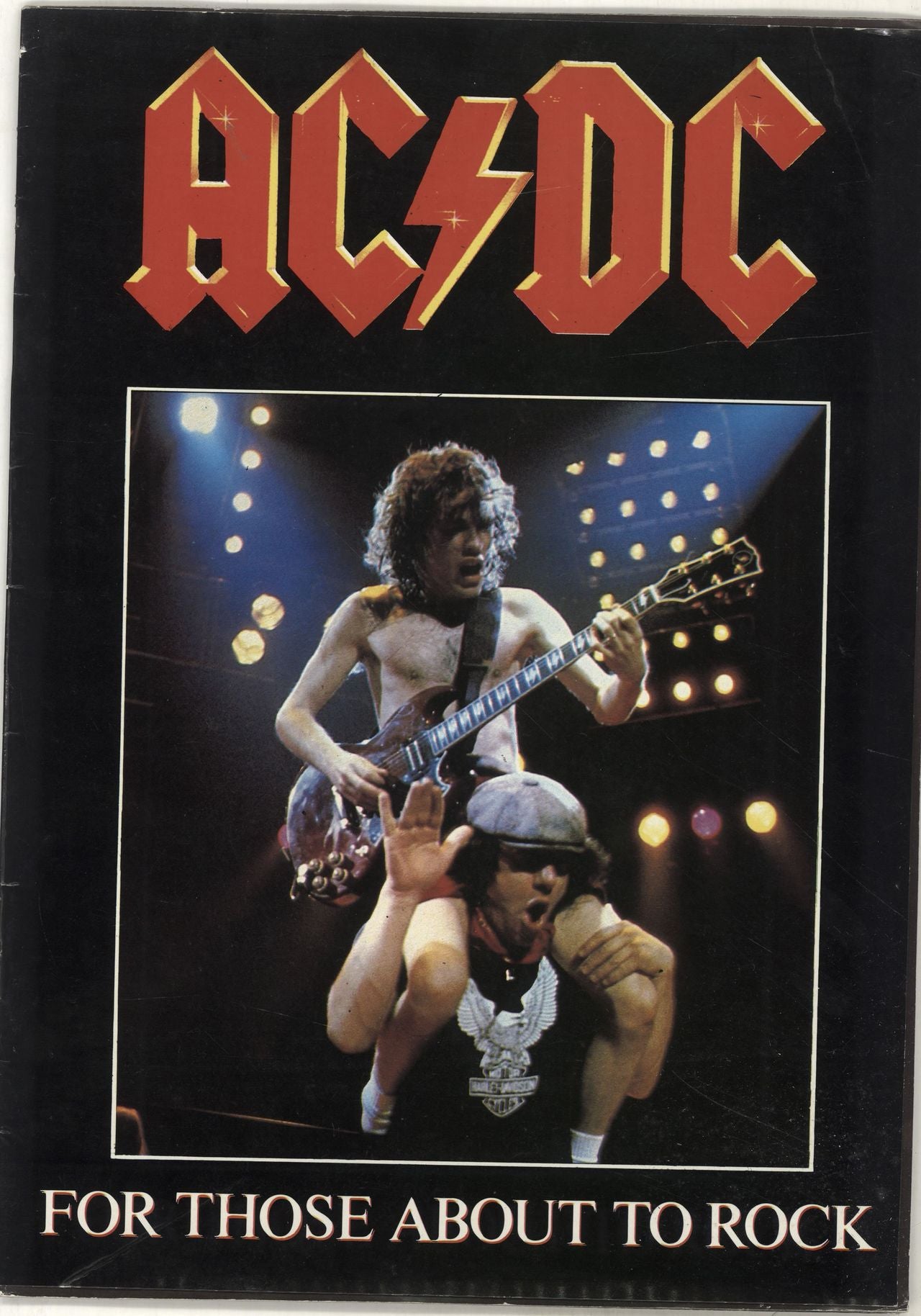 AC/DC For Those About To Rock (Official 1982 UK 28-page 13" x 8½" tour programme, packed with photographs of the band onstage and at play, including double-page spreads of each group member, tour dates, credits and quotes.The picture cover featuring Angus sitting on Brian's shoulders. This copy has some storage marks and creasing on the cover, but the inner pages remain in excellent condition)