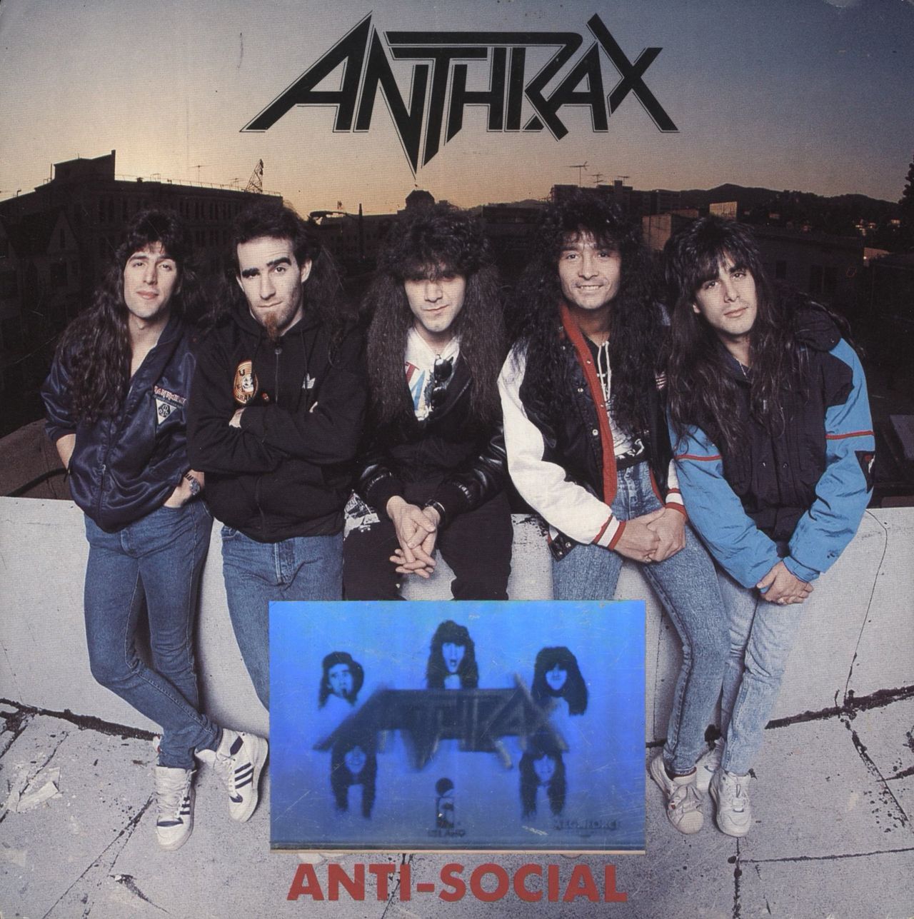 ANTHRAX Anti-Social (1989 UK limited edition solid centre 7" vinyl single, also including the previously unreleased track Parasite, housed in a paper picture sleeve with a scarce holographic sticker attached. The sleeve has only light wear andthe vinyl has minimal signs of play IS409)