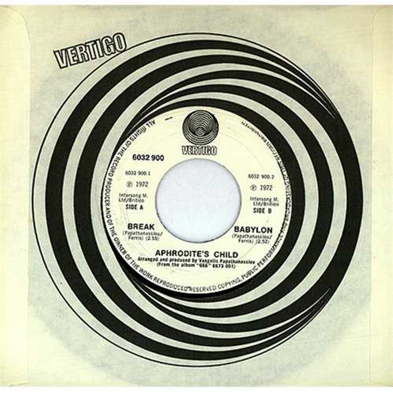 APHRODITE'S CHILD Break (1972 UK wide centred vinyl 7" single on the 'swirl' Vertigo label, also including Babylon, comes in a Vertigo record company die-cut paper sleeve)