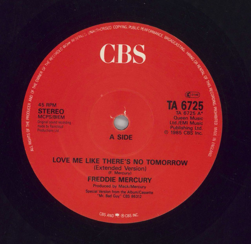 FREDDIE MERCURY Love Me Like There's No Tomorrow (1985 UK 12" vinyl single featuring Extended Version plus Let's Turn It On [Extended Version]. The glossy picture sleeve shows some corner creasing and ringwear, whilst the vinyl displays a fewvery light cosmetic scuffs, none of which are raised and would not impact play TA6725)