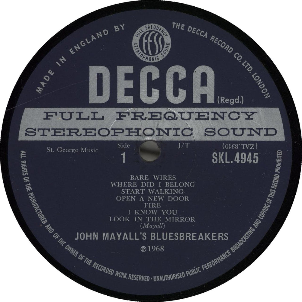 JOHN MAYALL'S BLUESBREAKERS Bare Wires (Rare 1968 UK first issue 13-track stereo LP on the 'ffss' unboxed Decca logo label, pressed on heavyweight vinyl & starring Chris Mercer, Dick Heckstall-Smith, Jon Hiseman, Henry Lowther, Mick Taylor & Tony Reeves, front laminated gatefold picture sleeve without Mono/Stereo hole on the back. The sleeve shows just a little light shelfwear with a some laminate lift along the spine, the labels has some spindle marks and the vinyl remains Very Good with some noticeable surface marks and the occasional light scratch. Although not mint, this is still a nice item, making an ideal play copy SKL4945)