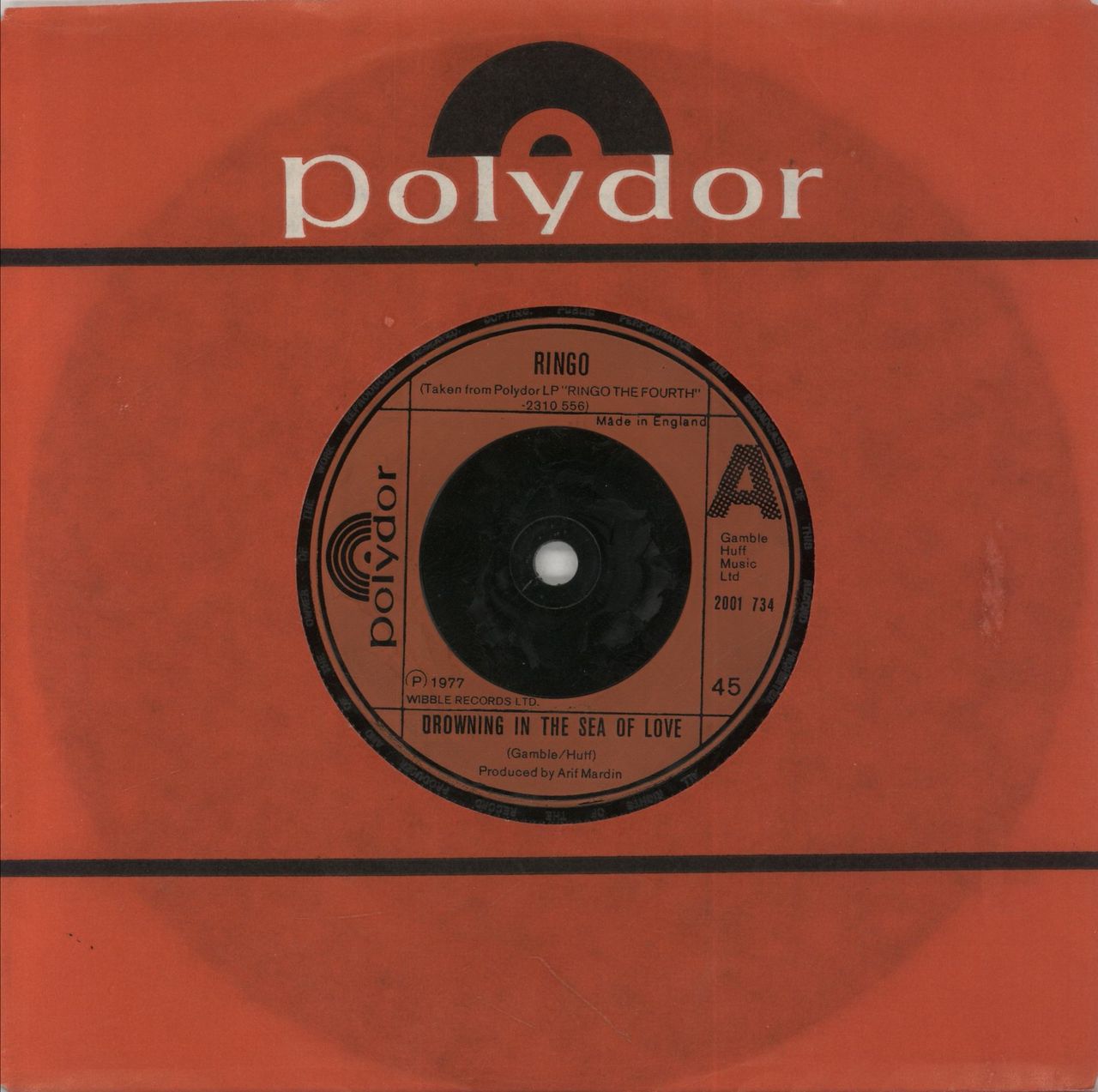RINGO STARR Drowning In The Sea Of Love (Rare 1977 UK Polydor injection moulded label vinyl 7" single also featuring Just A Dream, housed in a generic Polydor die cut company sleeve - This was never issued with a picture sleeve in the UK. Thevinyl displays two of the faintest cosmetic marks [not impacting play] with no other obvious signs of wear - an excellent example of this rare Ringo single!)