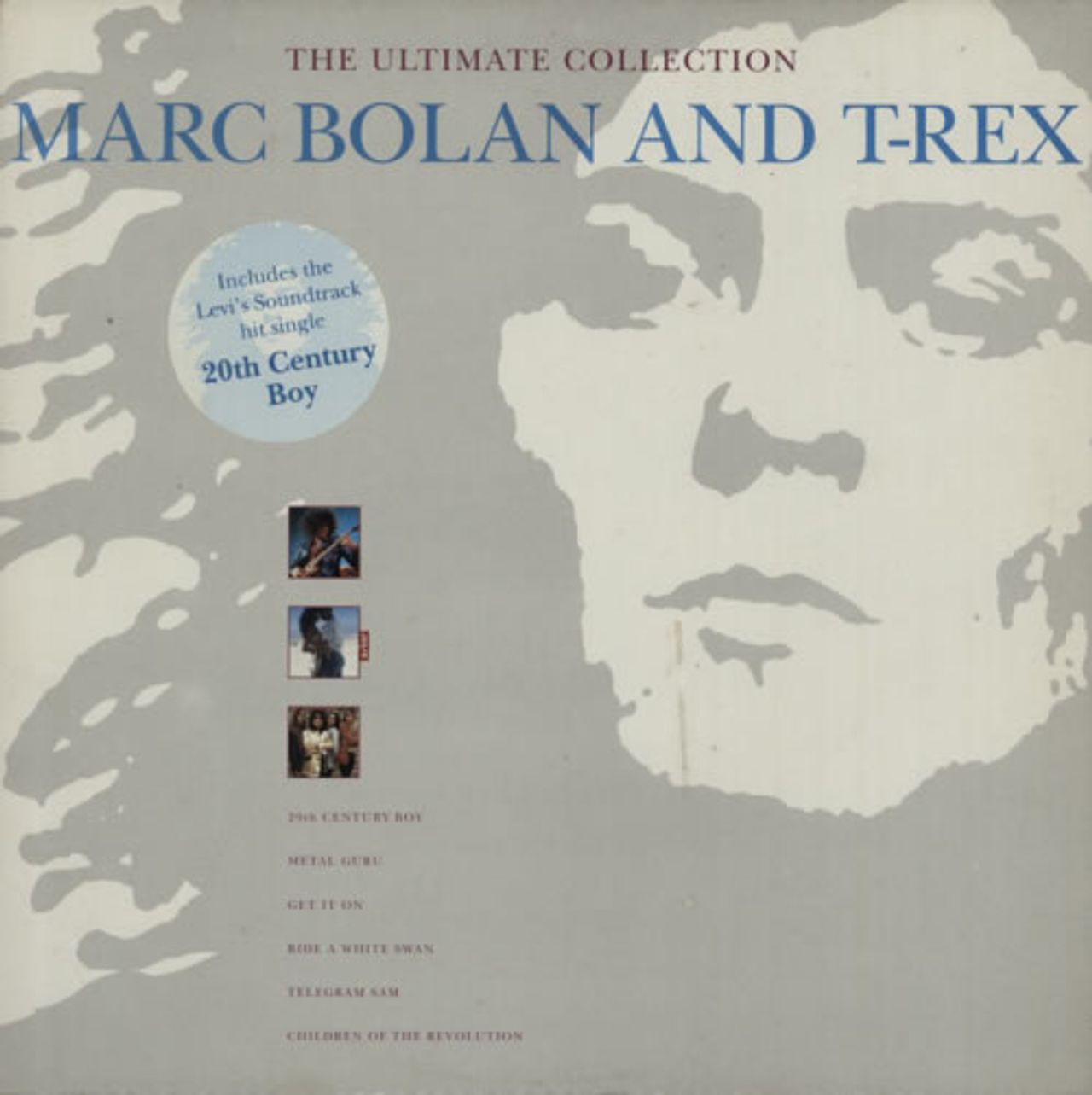 MARC BOLAN & T-REX The Ultimate Collection (1991 UK 20-track LP compilation, including Deborah, One Inch Rock, Ride A White Swan, Get It On, Hot Love, Jeepster & I Love To Boogie. Comes housed in a non-embossed picture sleeve with the hype sticker attached, including the picture/biography inner & fan club insert. The sleeve & vinyl remain in Excellent condition STAR2539)