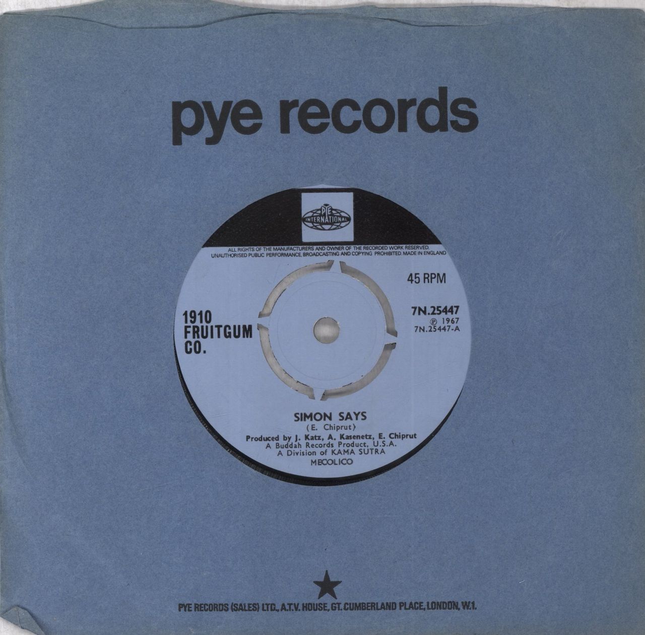 1910 FRUITGUM COMPANY Simon Says (1967 UK 7" vinyl single with intact four prong centre, also including Reflections From The Looking Glass, Pye company die-cut paper sleeve 7N.25447)