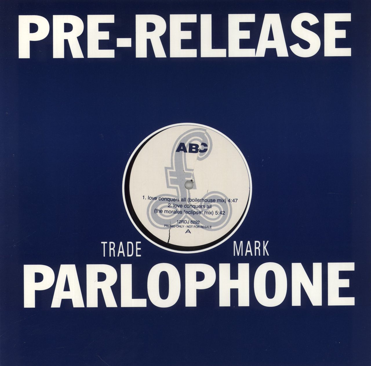 ABC Love Conquers All (1991 UK promotional 4-track vinyl 12" starring guitarist Phil Manzanera, and featuring remixes by Boilerhouse, David Morales and producer David Bascombe, housed in a die-cut 'Pre-Release' sleeve 12RDJ6292)