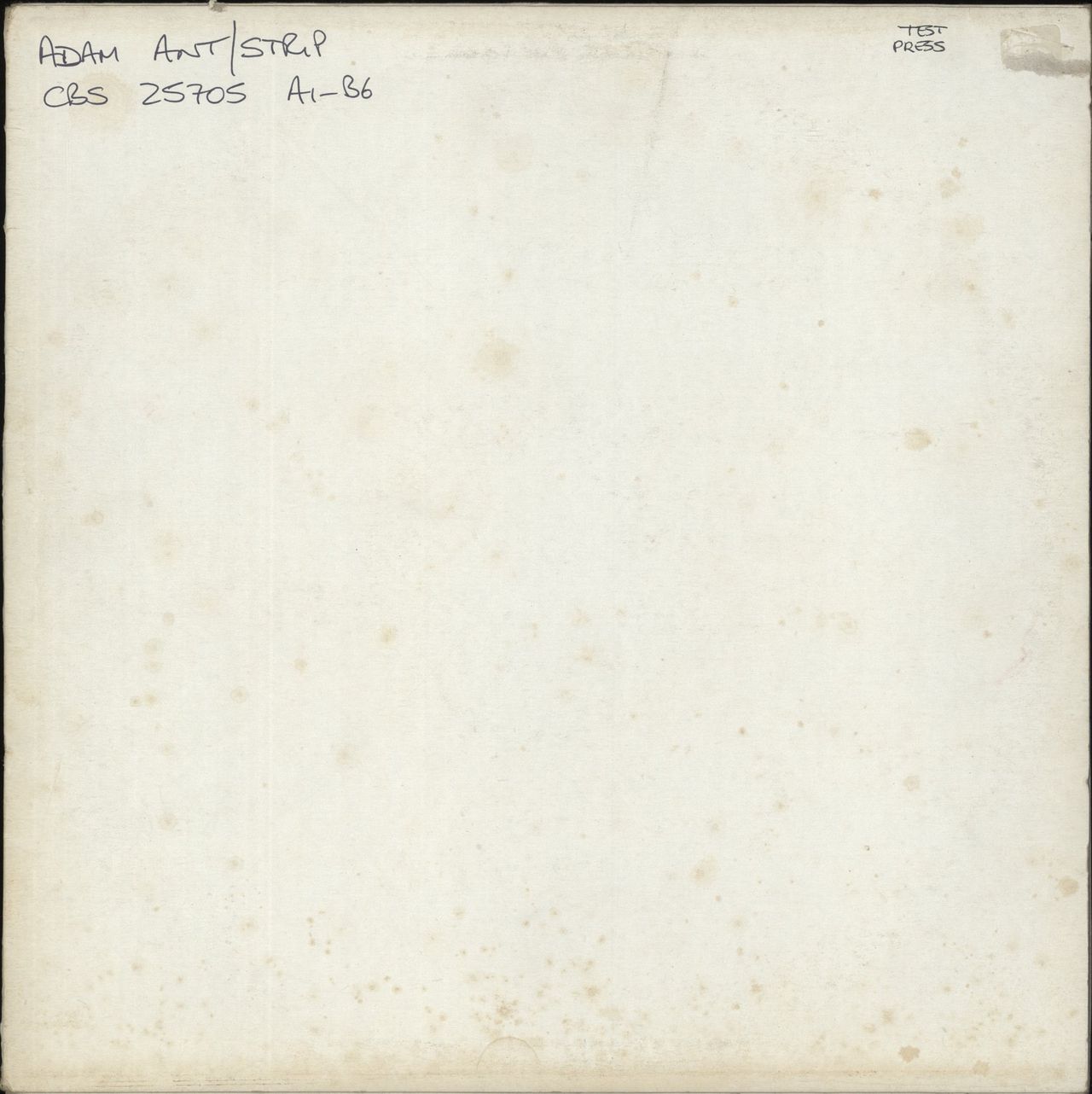 ADAM ANT Strip (Rare 1983 UK white label test pressing for the 10-track vinyl LP, including the hit singles “Puss ’n Boots”, “Strip” and “Playboy”. With A1/B6 matrices and plain white labels, test pressings such as this seldom surface on themarket as only a handful were produced. This copy comes housed in a plain sleeve with the vinyl remaining Excellent with just light signs of play. CBS25705)