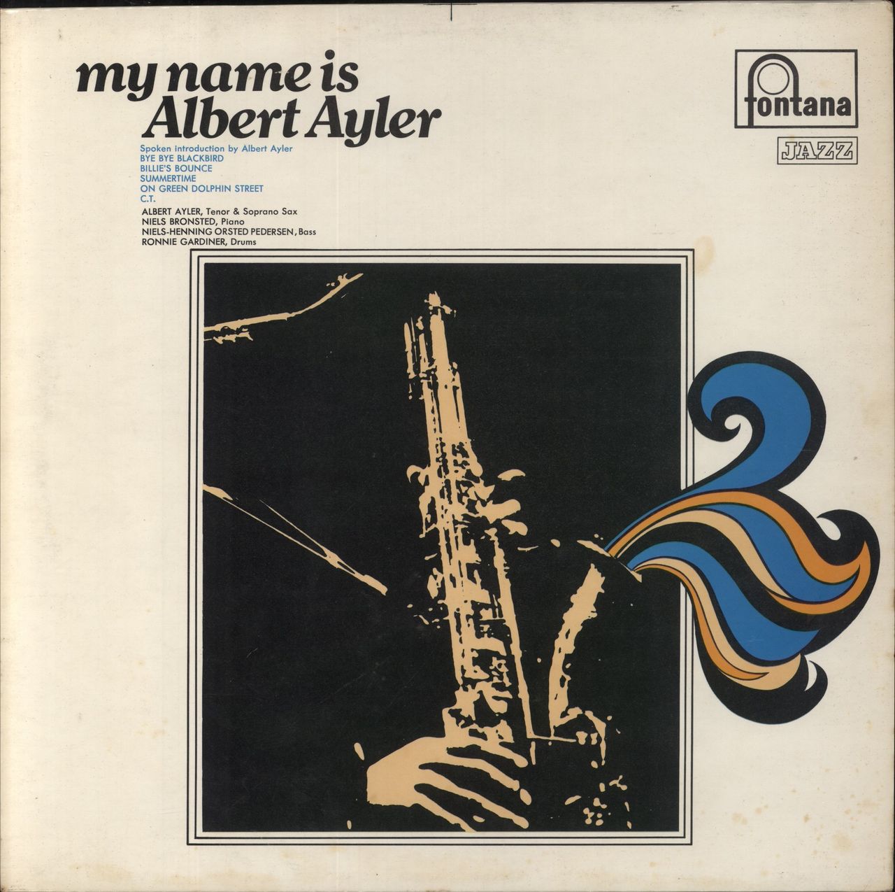ALBERT AYLER My Name Is Albert Ayler (1969 UK 6-track stereo LP, the debut album from Ayler, created shortly after his relocation to Sweden. This session features a collection of standards recorded January 14, 1963 for a Copenhagen radio station, with local musicians including Niels-Henning Ørsted Pedersen & drummer Ronnie Gardiner, with Ayler playing tenor & soprano on tracks like 'Summertime'. The laminated picture sleeve is Excellent with a spot of edge scuffing & minor foxing. The vinyl is clean & in Excellent condition SFJL927)