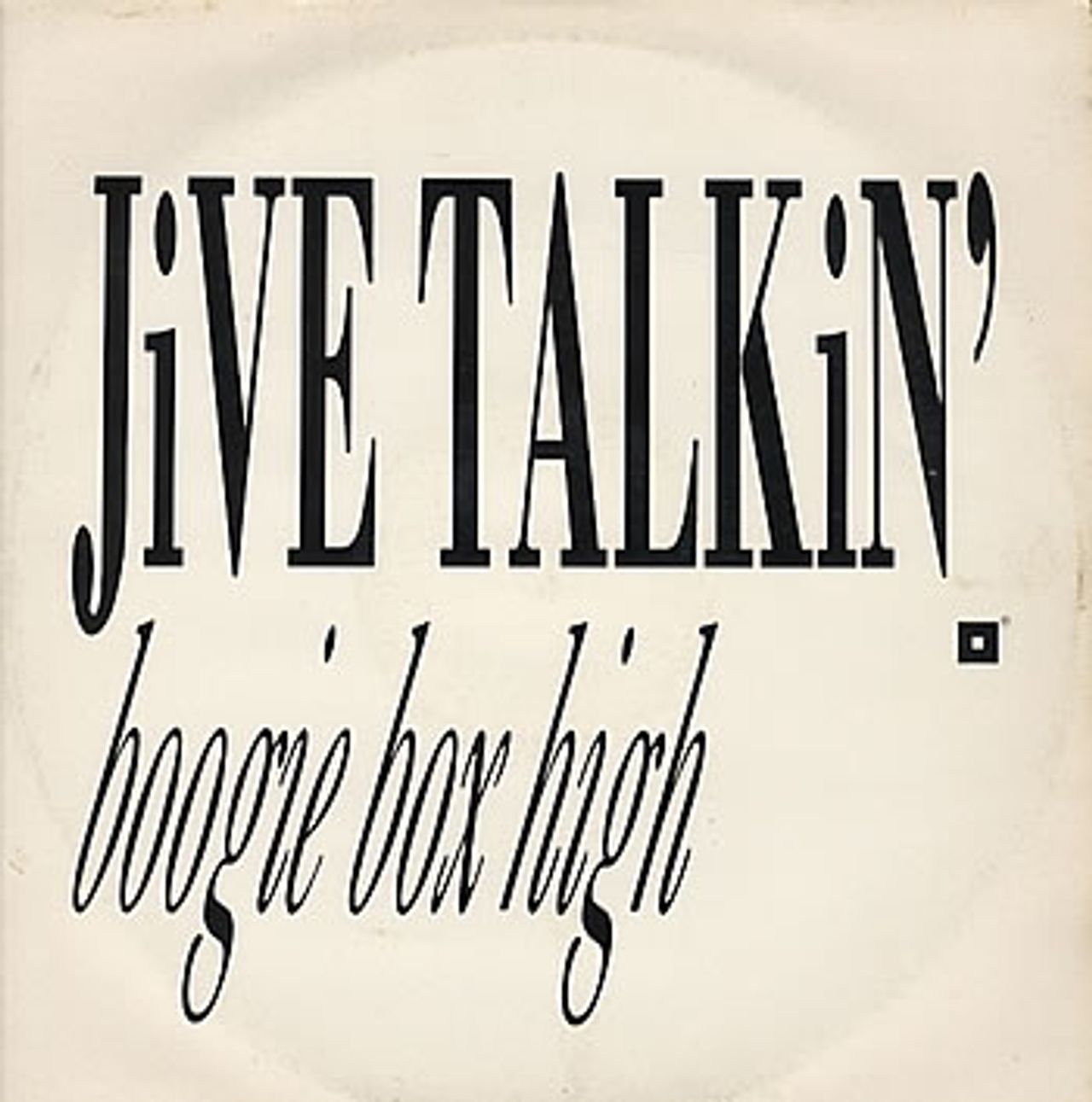 BOOGIE BOX HIGH Jive Talkin' (1987 UK Hardback label 3-track 12" vinyl single produced by George Michael, featuring Fever Pitch Mix & Rhythm Talkin'. The black & white title sleeve displays just a little light ringwear, mainly to the backcover, whilst the vinyl has only light signs of play and remains excellent BOSS4)