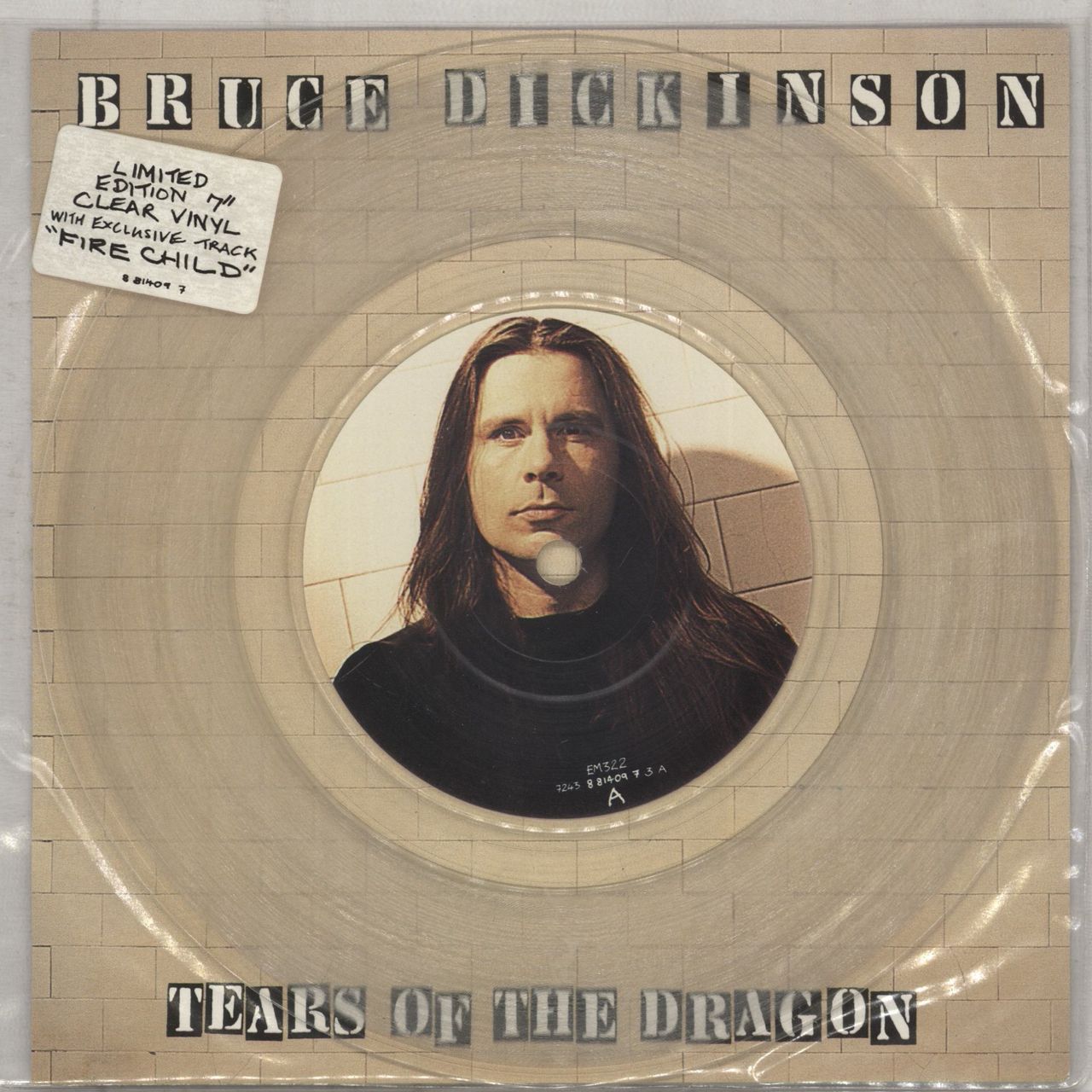 BRUCE DICKINSON Tears Of The Dragon (1994 UK limited edition 7" single pressed on Clear Vinyl with picture label, also including Fire Child, housed in a clear PVC sleeve with original hype sticker plus picture insert EM322)