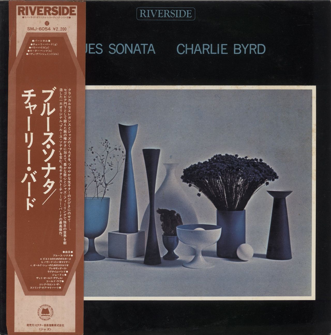 CHARLIE BYRD Blues Sonata (1974 Japanese stereo sample issue of the 1961 5-track LP with custom white promotional labels, also features Barry Harris on Piano, Keter Betts on Bass & Buddy Deppenschmidt on Drums, pasted picture sleeve reproducing the original album artwork with Japanese insert and obi-strip. The sleeve shows noticeable foxing to the reverse and the vinyl is Near Mint SMJ-6054)