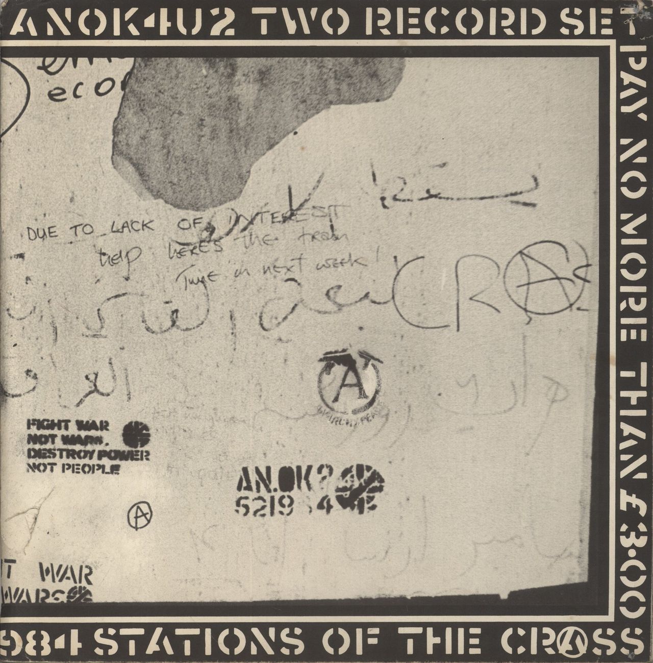 CRASS Stations Of The Crass (1980 UK first press 37-track double LP featuring three sides of studio material & one side of live tracks from a gig recorded at the Pied Bull pub in Islington, London on 7 August 1979. Comes housed in a superb wraparound fold-out poster sleeve with cover artwork of a graffiti decorated wall [done by the band themselves] at London's Tottenham Court Road tube station plus the original £3.00 price point. The sleeve shows signs of having been displayed andhas a tear to the front, whilst the vinyl shows moderate hairlines & scuffs leaving it VG)