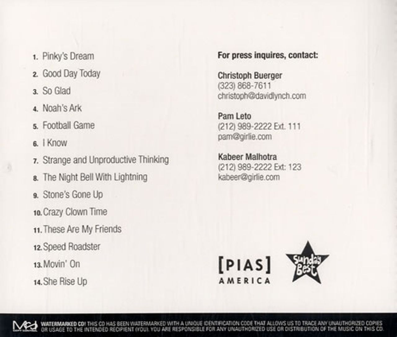 DAVID LYNCH Crazy Clown Time (Official 2011 US [Pias] America/Sunday Best label 14-track advance promotional watermarked & numbered CD-R acetate for the debut album from the visionary filmmaker, with custom printed disc complete with a custom studio title/tracklisting inlay)