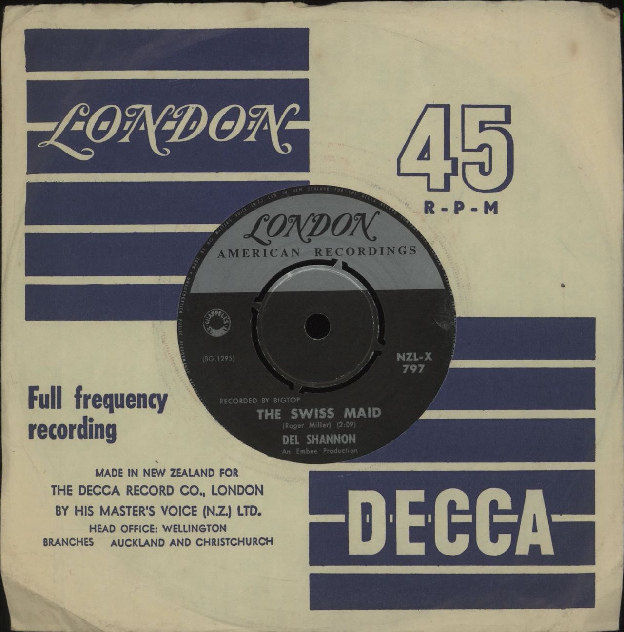 DEL SHANNON The Swiss Maid (1962 New Zealand 7" vinyl single with intact four prong centre, also featuring You Never Talked ABout Me, London / Decca group die cut paper sleeve. The vinyl on this copy remains in Excellent condition with just afew light surface scuffs to show for its fifty five years NZL-X797)