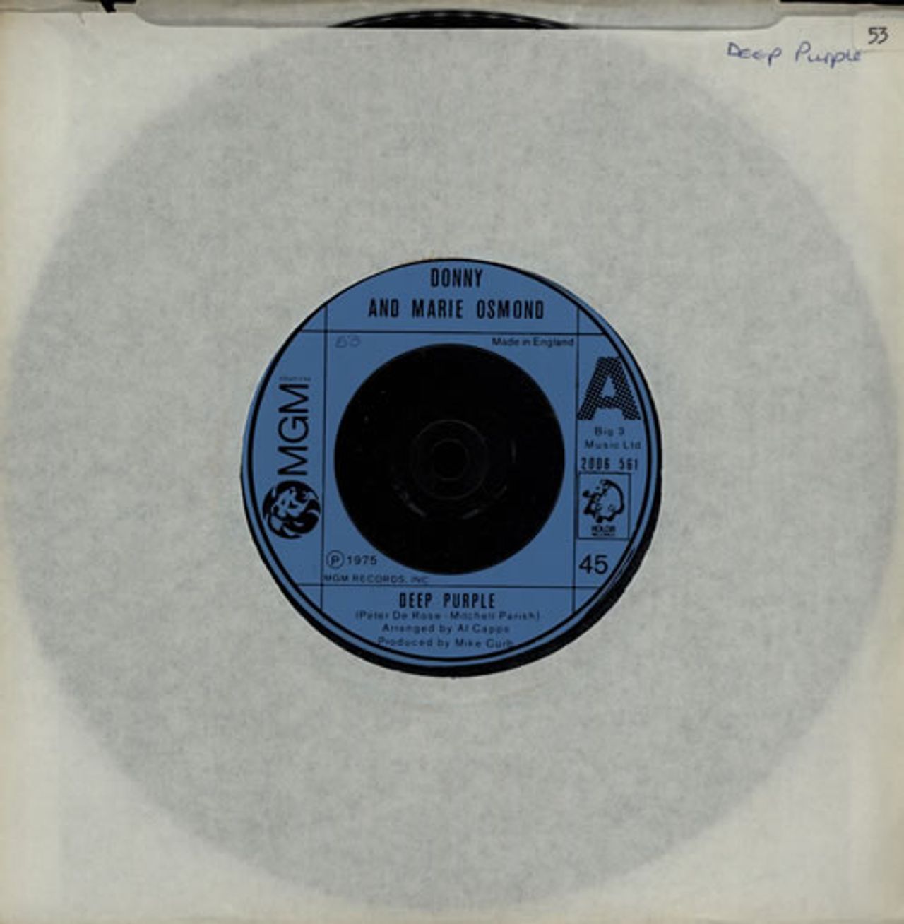 DONNY & MARIE OSMOND Deep Purple (1975 UK injection moulded 7" vinyl single, also includes 'Take Me Back Again', plain company die-cut paper sleeve)