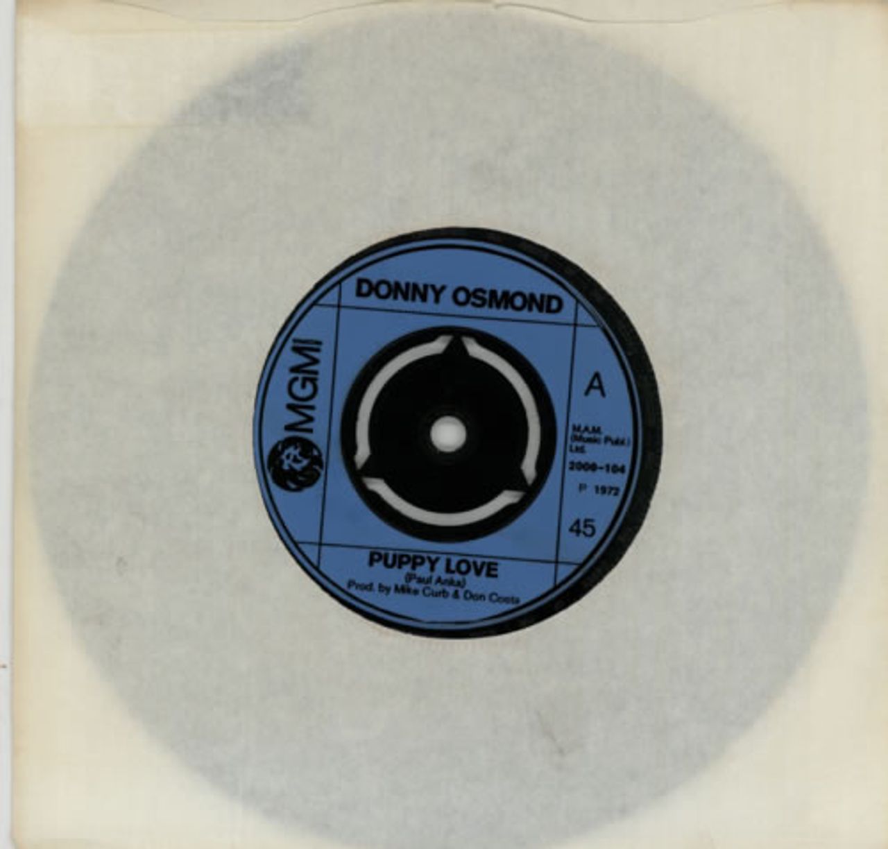DONNY OSMOND Puppy Love (1972 UK 7" vinyl single with intact original three prong centre, also featuring Let My People Go, plain die cut paper sleeve)