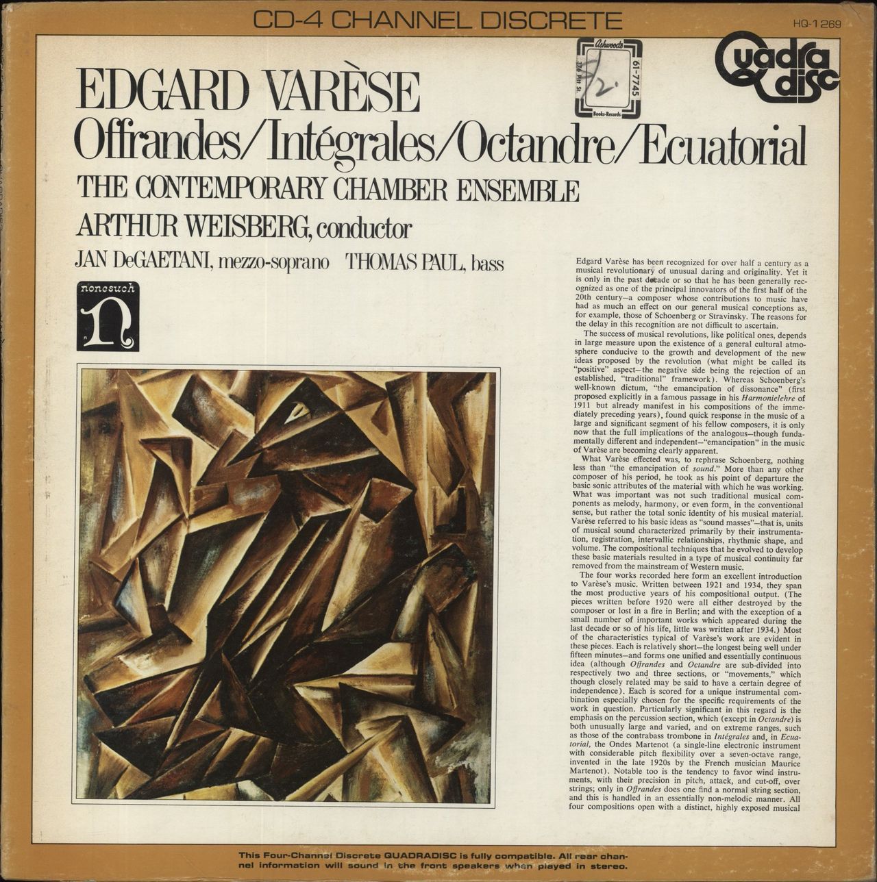 THE CONTEMPORARY CHAMBER ORCHESTRA ENSEMBLE conducted by ARTHUR WEISBERG Varèse: Offrandes / Intégrales / Octandre / Ecuatorial (1973 US 4-track quadraphonic vinyl LP [compatible with stereo systems], picture sleeve with vintage price sticker and series inner. The sleeve shows light wear and despite an annotation to one label, the vinyl appears barely played HQ-1269)