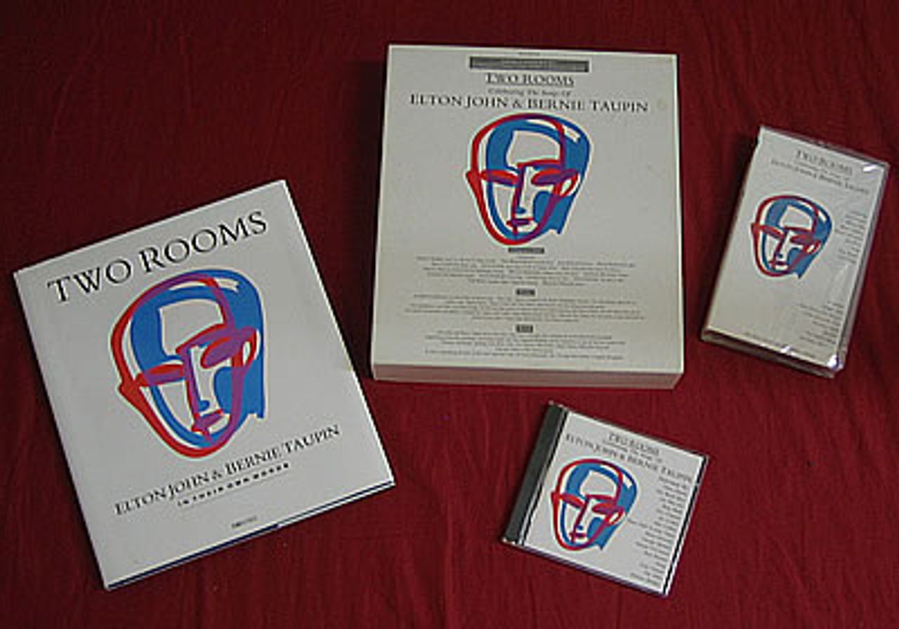 ELTON JOHN Two Rooms (1991 UK limited edition box set 'Celebrating The Songs Of Elton John and Bernie Taupin', includes 16-track CD album featuring tracks performed by The Beach Boys, Jon Bon Jovi, The Who, Eric Clapton, Kate Bush, Sting, RodStewart and George Michael, in a picture sleeve, plus 90-minute PAL video featuring unreleased footage and interviews in sealed picture video case. Also includes 128-page glossy hardback book, in which they discuss in their own words,each other, touring, the origins of their songs and much more, with many photographs from childhood to superstardom. Housed in a 11½" x 10" x 2" picture box. Tha box has a small split to the left corner whilst all content is in Excellent condition)