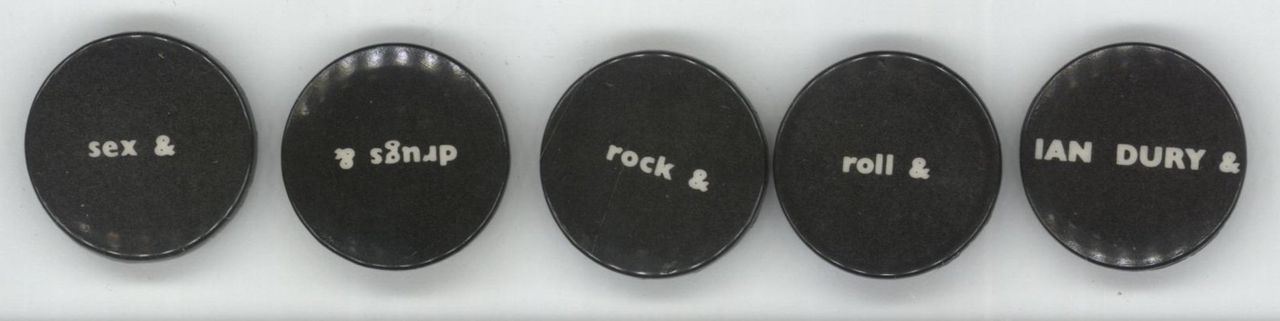 IAN DURY Sex & Drugs & Rock & Roll (Rare and original 1977 UK complete set of five button badges. Designed by Stiff's legendary in-house artist Barney Bubbles [Hawkind, Damned, Elvis Costello, Ian Dury and many more!] the badges are true to Barney's/Stiff's maverick approach to design and promotion with each item forming a part of the following sentence; "Ian Dury & Sex & Drugs & Rock & Roll"! Measuring 15.9mm in diameter and obtained from a former Stiff Records employee, they show nowear and have remained unused for the past forty-eight years - a small [yet very desirable] artefact from the British punk scene. Essential)