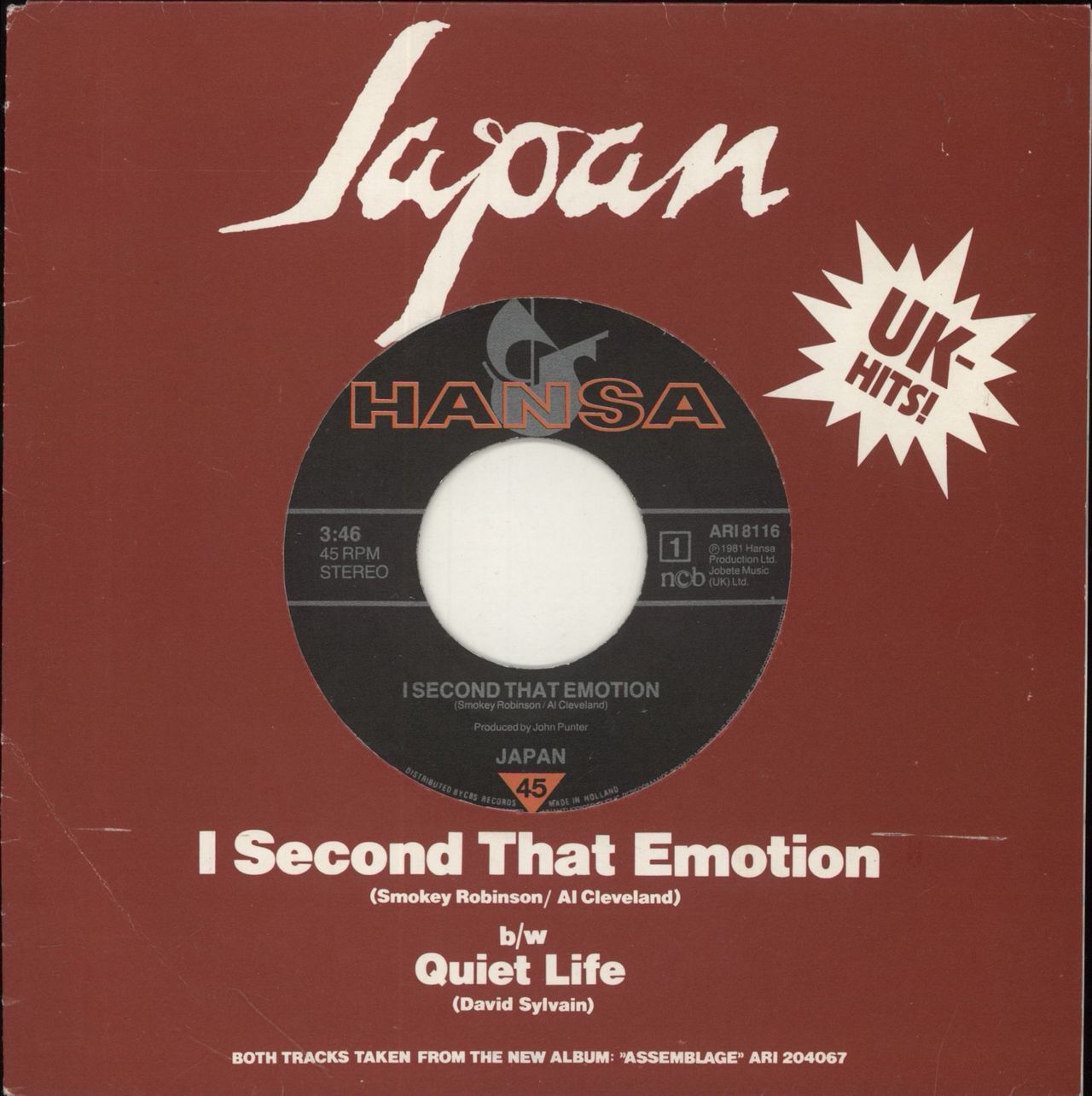 JAPAN I Second That Emotion (1981 Swedish promotional wide-centred vinyl 7" pressed in Holland, also including Quiet Life. Issued to promote the album 'Assemblage' in Scandanavian countries. Housed in a custom die-cut title sleeve with 'UK-Hits!' text. The sleeve shows some light creasing, whislt the vinyl is near as new ARI8116)