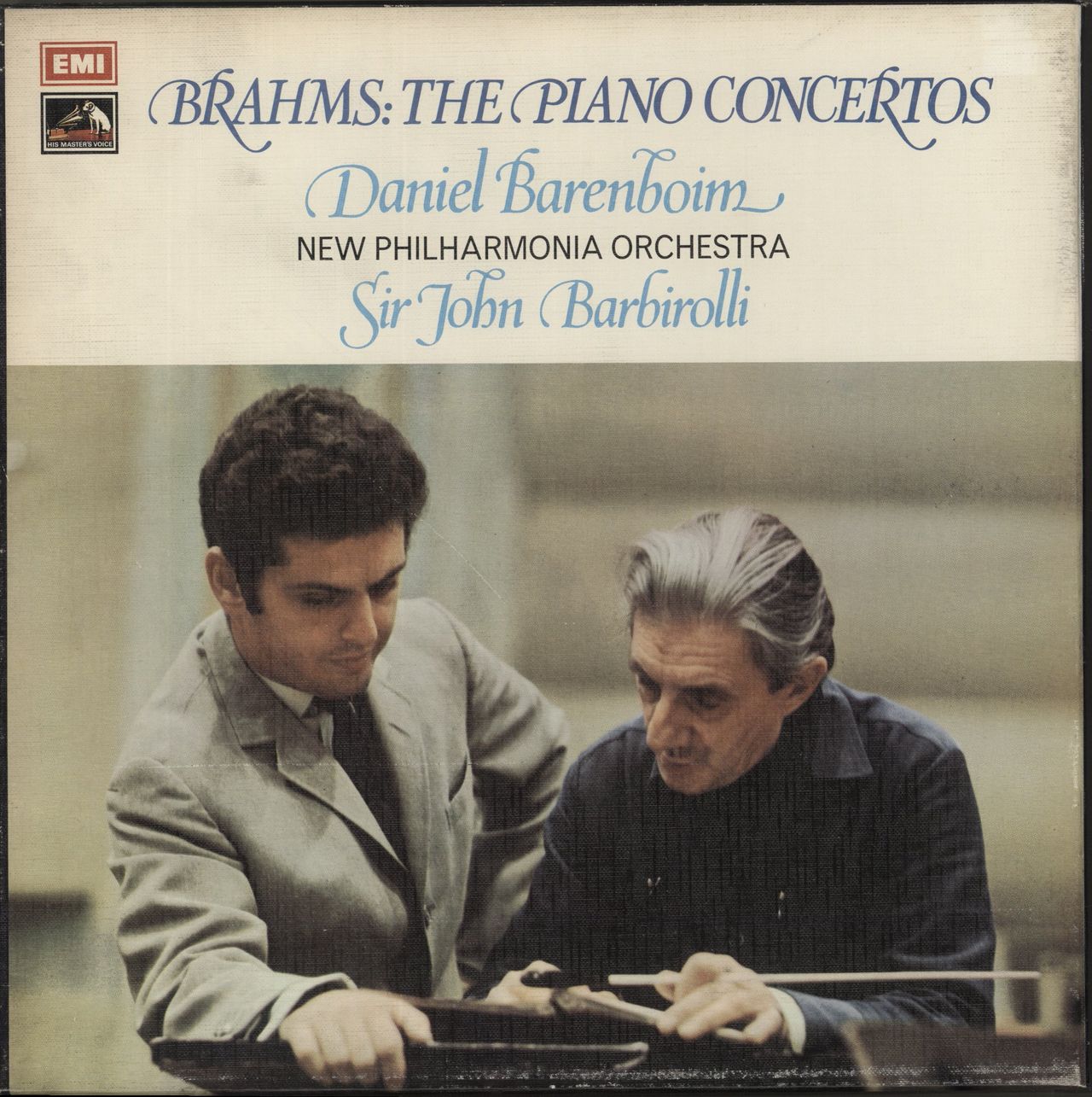 DANIEL BARENBOIM with the NEW PHILHARMONIA ORCHESTRA conducted by SIR JOHN BARBIROLLI Brahms: The Piano Concertos (1973 UK 7-track double vinyl LP, textured picture box with sleevenotes insert. The sleeve shows light wear and the vinyl is NearMint SLS874)