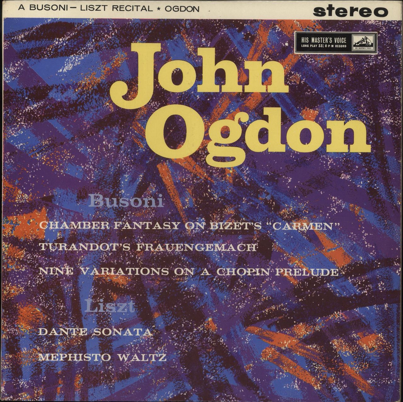 JOHN OGDON A Busoni - Liszt Recital (1961 UK first issue 5-track stereo vinyl LP on the cream & gold HMV label, front laminated flipback picture sleeve with 'MT' tax sticker to the reverse. The sleve shows minimal wear and the vinyl is Near Mint ASD434)
