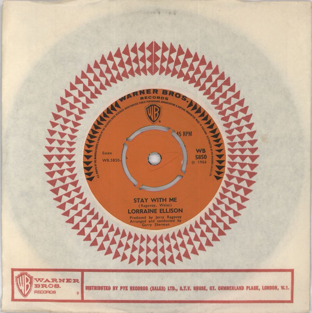 LORRAINE ELLISON Stay With Me (1966 UK 7" vinyl single with intact four prong centre, also including I Got My Baby Back, Warner Brothers die-cut paper sleeve. The vinyl on this copy remains in excellent condition with very little play WB5850)