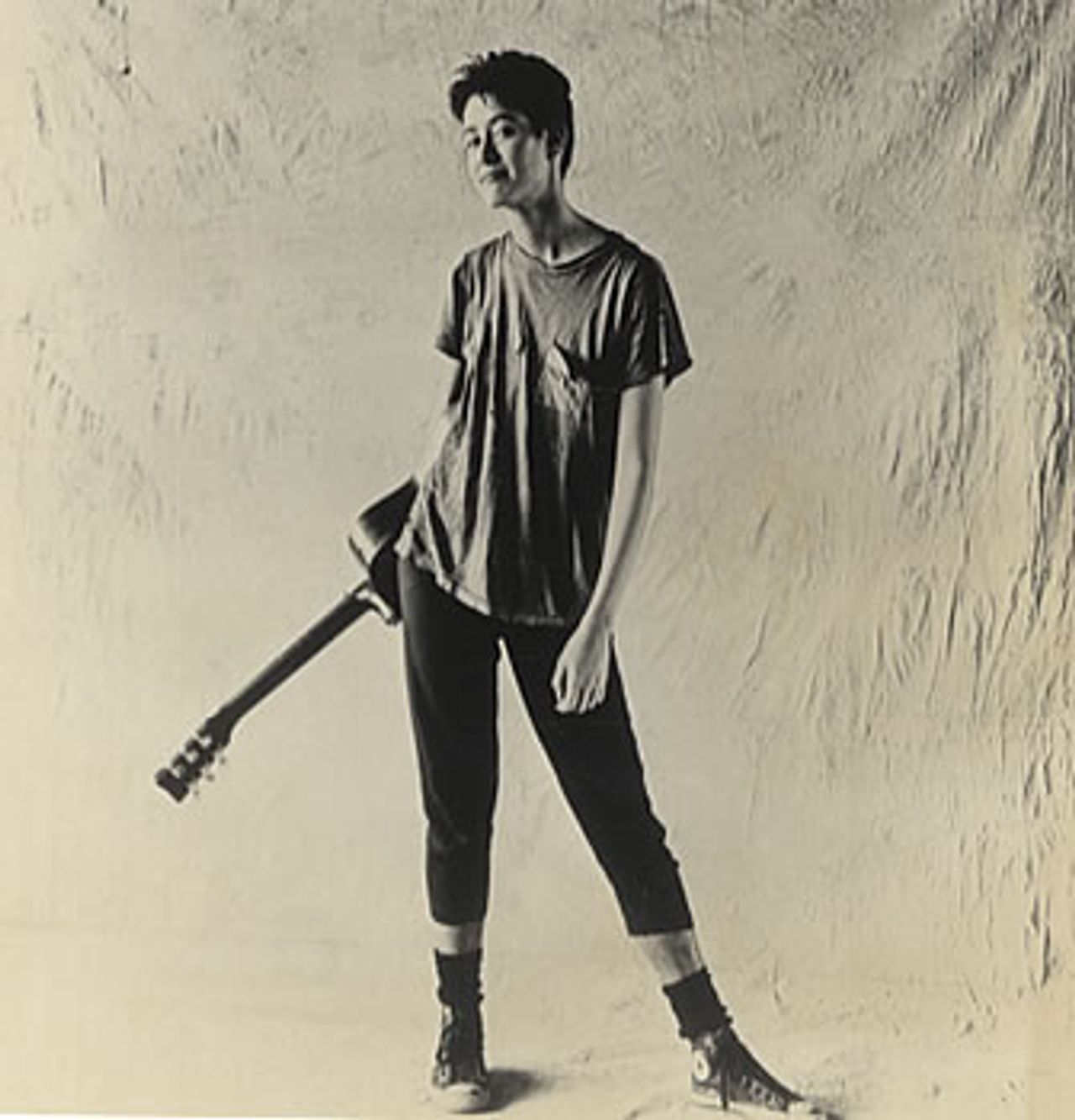 MICHELLE SHOCKED Publicity Photograph (Superb UK 7.5"x7.5" black & white photo taken by a professional photographer, features a full- length shot of Michelle dressed in an unironed T-Shirt, black 3/4 length leggins & baseball boots holding her guitar - Complete with the photographers handwritten notations of page numbers for publications where the photo appeared written on the reverse - ideal for framing!!)