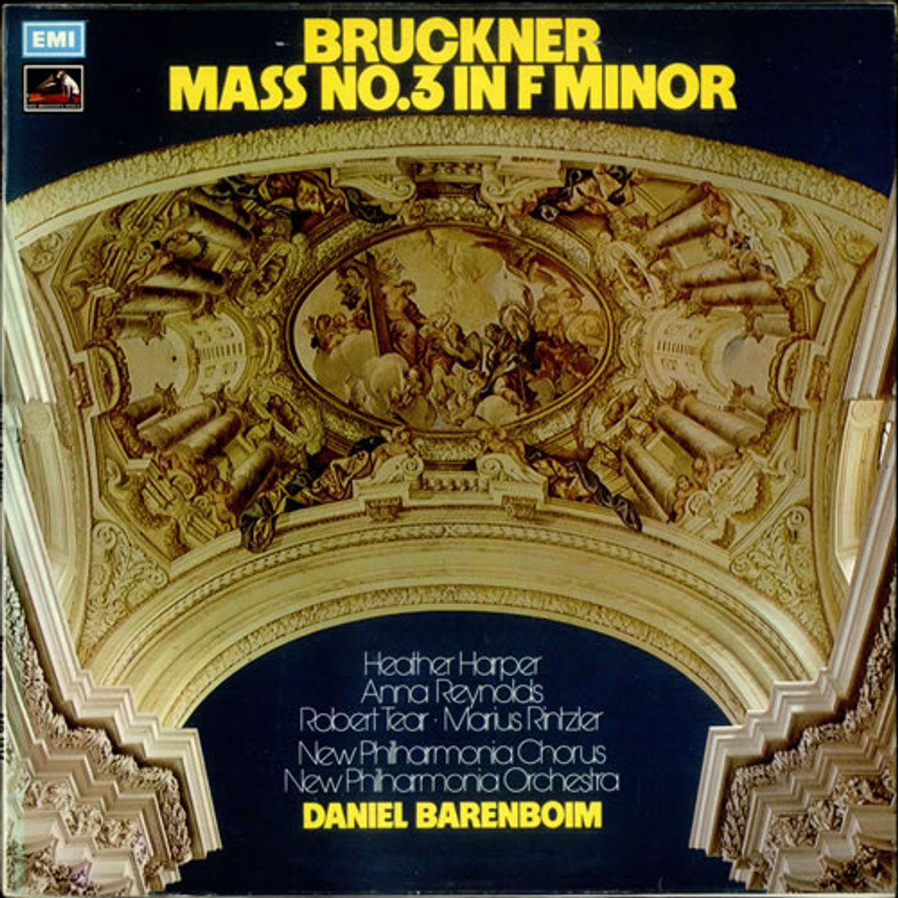 BRUCKNER Mass No. 3 in F minor (1972 UK HMV black and white stamp label stereo vinyl LP. Performed by Heather Harper, Anna Reynolds, Robert Tear and Marius Rintzler with the New Philharmonia Orchestra and Chorus conducted by Daniel Barenboim.Front laminated picture sleeve with extensive liner notes ASD2836)