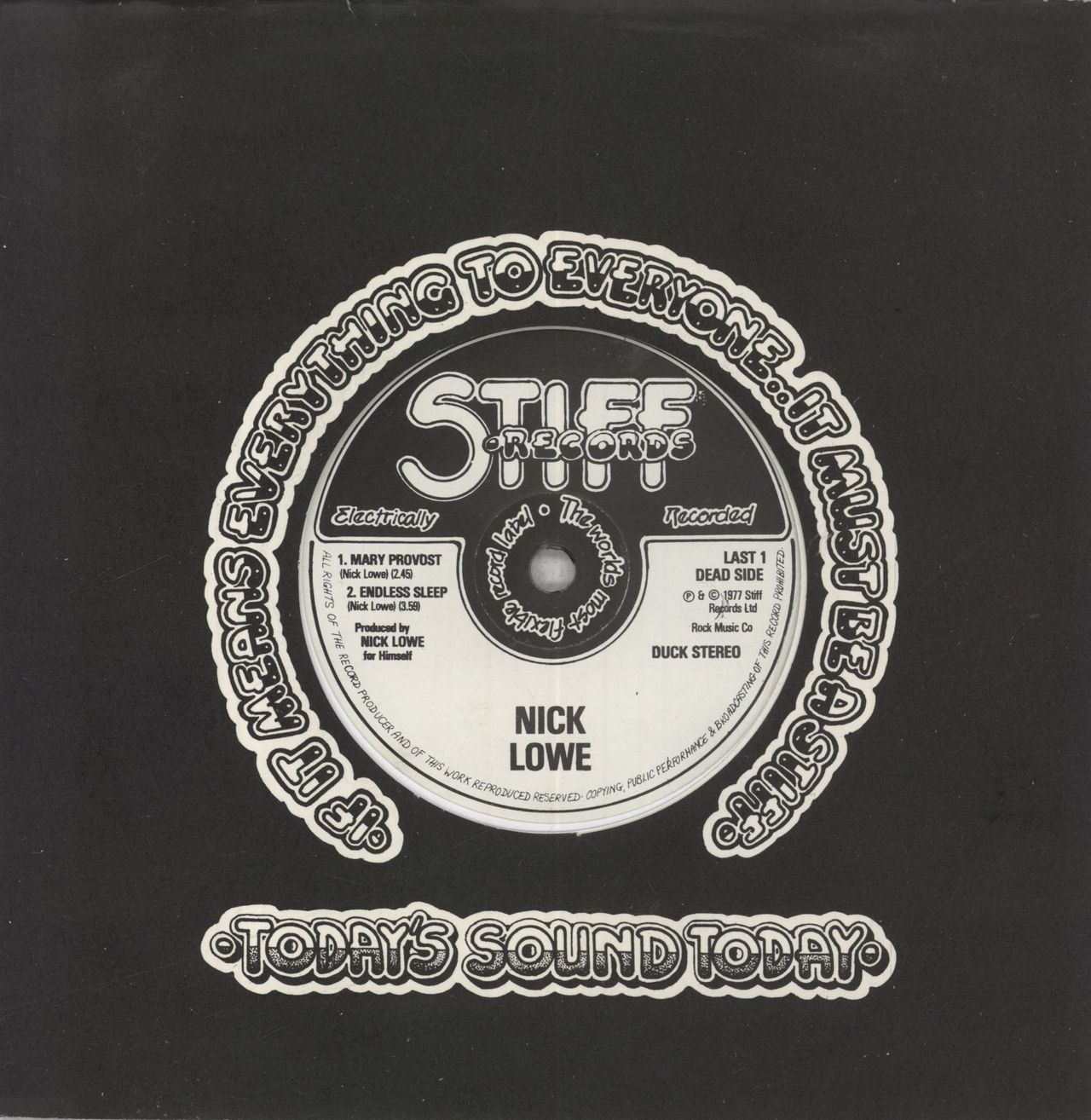 NICK LOWE Bowi (1977 UK 4-track 7" vinyl EP featuring Nick's revenge on David for releasing an album called 'Low', including live versions of Born A Woman & Shake That Rat along with studio versions of Marie Provost & Endless Sleep, Stiff company die-cut paper sleeve LAST1)