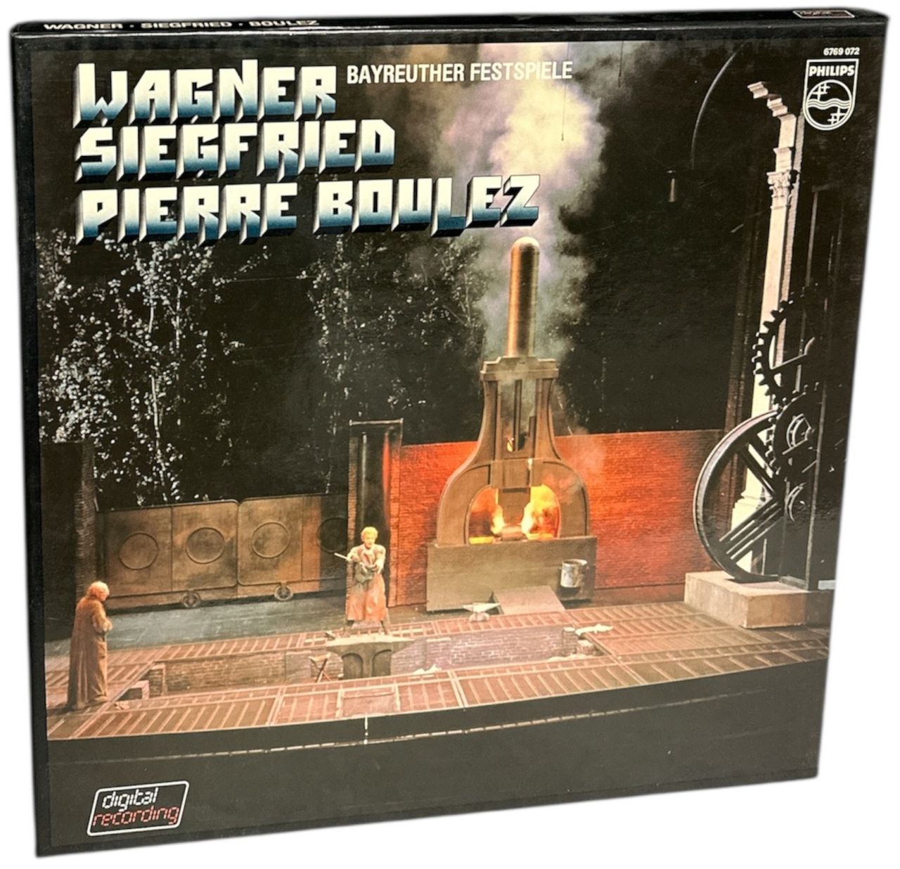 PIERRE BOULEZ conducts the ORCHESTRE BAYREUTHER FESTSPIELE Wagner: Siegfried (1981 German digital recording 9-track 4-LP vinyl set, picture box with 42-page libretto booklet. The box shows minimal wear and the vinyl is Near Mint)