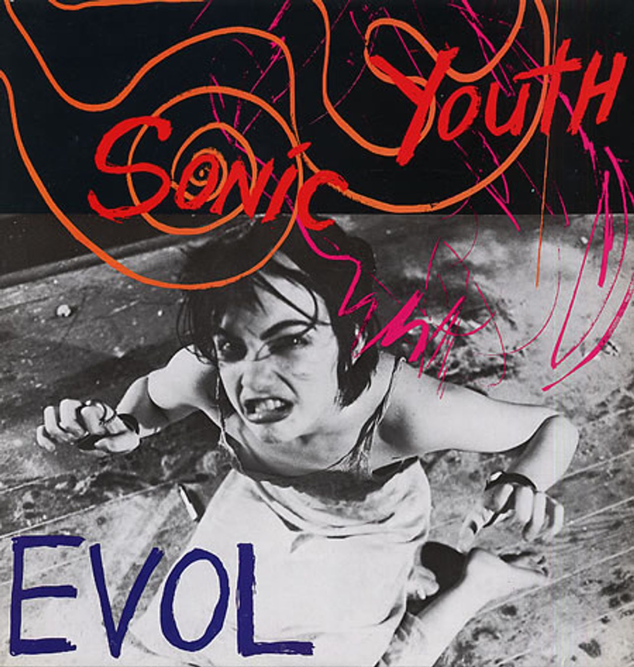SONIC YOUTH Evol (Classic 1986 UK 9-track vinyl LP on the black & white label with 'Everything Black Turns to Blue' etched into the Side 2 dead wax, picture sleeve with artwork lyric inner. Includes the single 'Star Power', the shimmering 'ShadowOf A Doubt' & the monumental album closer 'Expressway To Yr. Skull', some hardcore fans consider this tobe Sonic Youth's finest moment. The picture sleeve shows some minor edge wear & the vinyl has light surface wear & the odd hairline leaving it Excellent BFFP4)