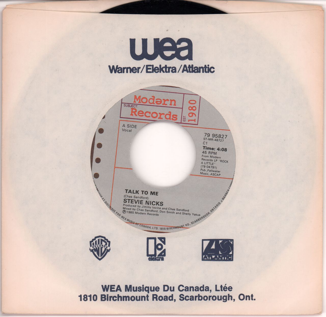 STEVIE NICKS Talk To Me (1985 Canadian Modern label wide centred 7" vinyl single, also including One More Big Time Rock And Roll Star, issued in a WEA company die-cut paper sleeve)