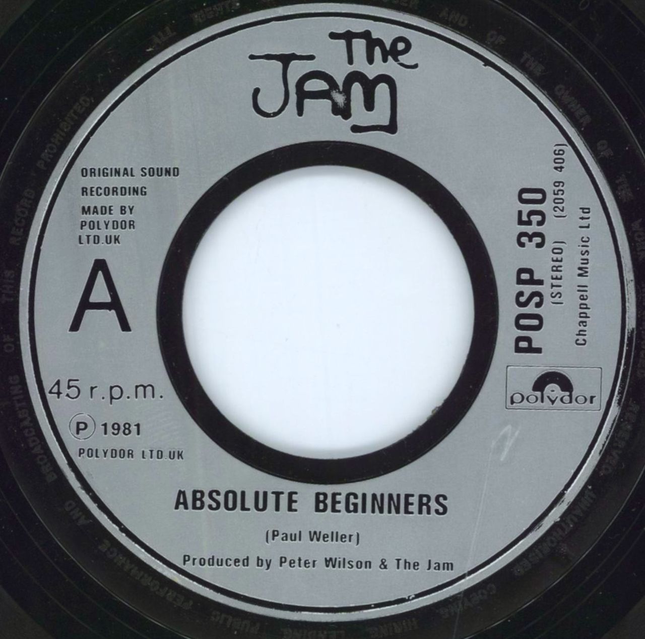 THE JAM Absolute Beginners (1981 UK black & silver injection moulded wide-centre 7" originally for jukebox use, also including the wonderful Tales From The Riverbank on the B-side. Plain die cut paper sleeve POSP350)