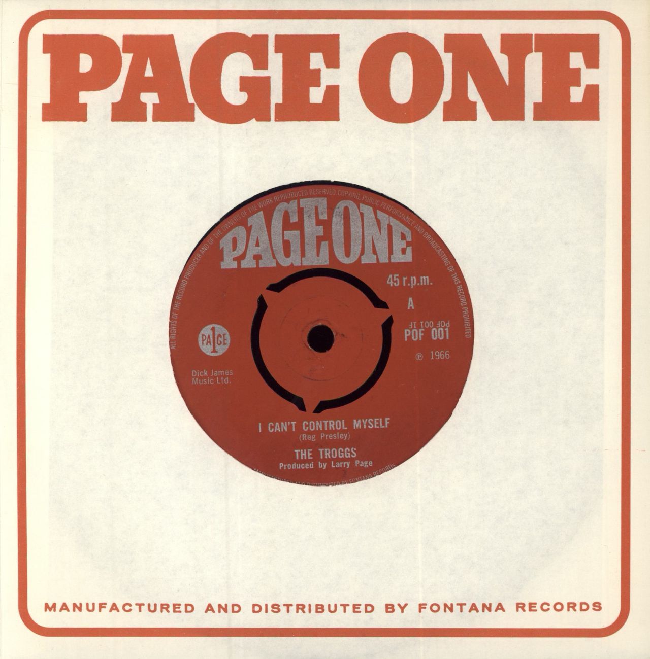 THE TROGGS I Can't Control Myself (1966 UK 7" single with intact three prong centre, also including Gonna Make You, Page One logo die cut paper sleeve POF001)