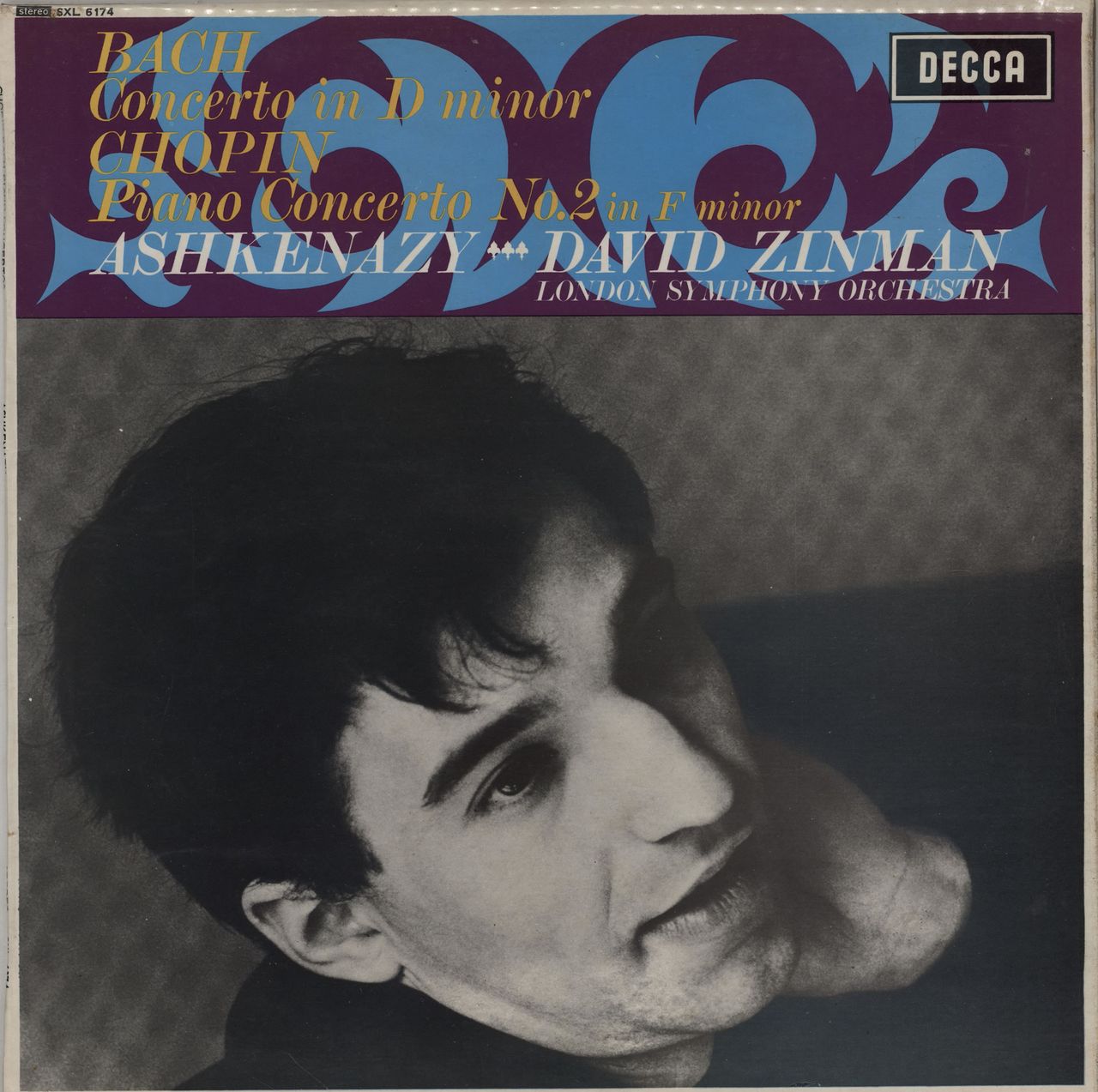 JOHANN SEBASTIAN BACH / CHOPIN Concerto in D minor / Piano Concerto No. 2 in F minor (70s issue UK 6-track Decca narrowband label stereo vinyl LP. Performed by Vladimir Ashkenazy with the London Symphony Orchestra conducted by David Zinman. Front laminated picture sleeve with extensive liner notes. The sleeve shows only a little shelfwear, especially to the edges, the labels have minimal spindlewear, whilst the vinyl appears barely played SXL6174)