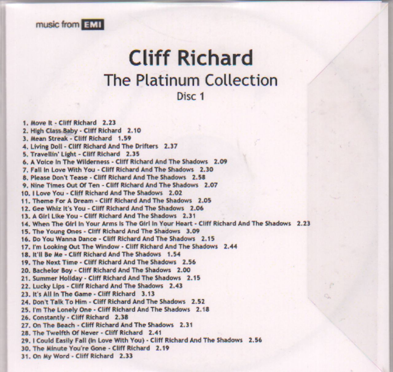 CLIFF RICHARD The Platinum Collection (2005 UK EMI 73-track 3 x promotional CD-R album set, issued exclusively to reviewers and radio stations. Featuring a collection of Cliff's biggest & best hits including Move It, Living Doll, Summer Holiday, The Young Ones, Devil Woman & The Millenium Prayer. Custom printed discs, title/tracklisting inserts and a press release)