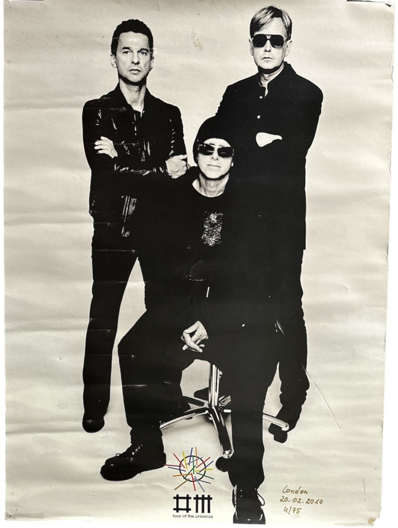 DEPECHE MODE Limited Print (Rare original 2010 UK limited edition tour poster, produced exclusively for sale at the merchandise stall during Depeche Mode’s Tour Of The Universe date at London’s O2 Arena on 20th February 2010. Measuring approximately 27½" x 19½", this striking design features a superb monochrome image of Andy Fletcher, Dave Gahan and Martin Gore, with the official Tour Of The Universe artwork and typography displayed beneath. Individually hand-numbered at the bottomin gold ink, this particular example reads ‘London 20.02.2010 – 04/75’, confirming it as one of only seventy-five prints created exclusively for that night’s show — a strictly limited run available only to attendees, making it a genuine piece of Depeche Mode concert history. The poster shows a few discreet pinholes to the corners and a small tear to the lower right edge and a little creasing from prior display, but otherwise remains in excellent shape. The image itself is clean and bold, making it a truly impressive piece for framing and display. A stunning and highly collectable limited edition print — barely seen on the secondary market, and a superb keepsake from the band’s celebrated Tour Of The Universe era)