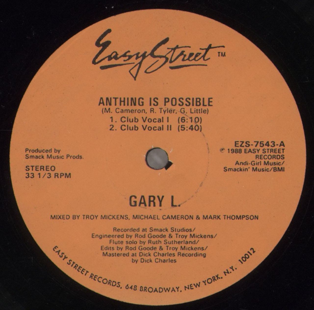 GARY LITTLE Anything Is Possible (1988 US 4-track 12" vinyl single, includes Club Vocal I, Club Vocal II, Club Sensation Dub and Club Cheetha Acid Mix, plain die-cut sleeve EZS-7543)