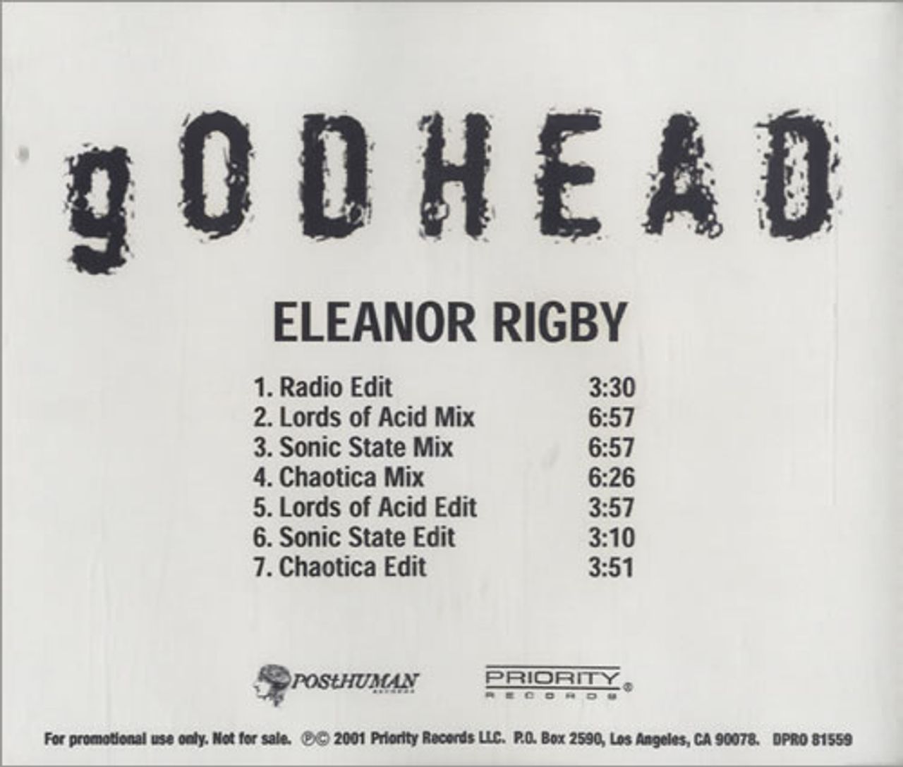 GODHEAD Eleanor Rigby (Official 2001 US Priority Records 7-track remix promotional CD-R acetate featuring their cover of The Beatles classic, originally taken from their '2000 Years of Human Error' album. Includes Radio Edit, Lords Of Acid Mix, Sonic State Mix and Chaotica Mix, custom printed disc + title/tracklisting back insert)