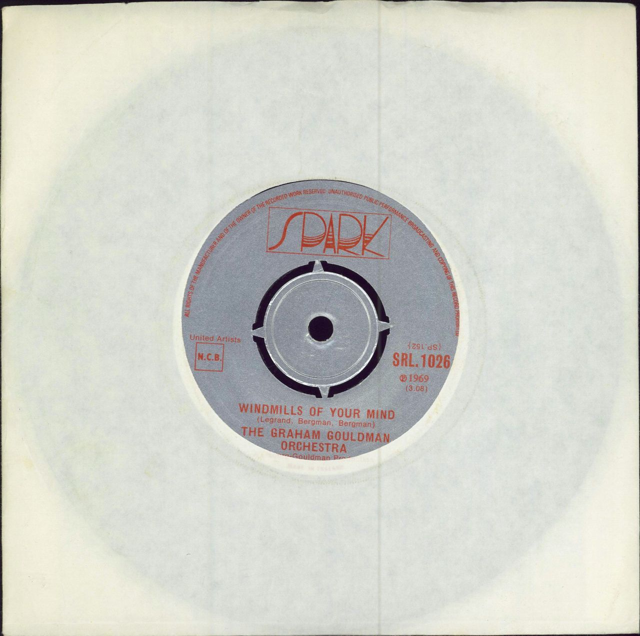 THE GRAHAM GOULDMAN ORCHESTRA Windmills Of Your Mind (1969 UK four-prong centre 7" single by a pre-10cc Graham Gouldman on the collectable Spark label, also featuring the b-side 'Harvey's Theme', plain die-cut sleeve. The vinyl is clean & in Excellent condition with very little play SRL1026)