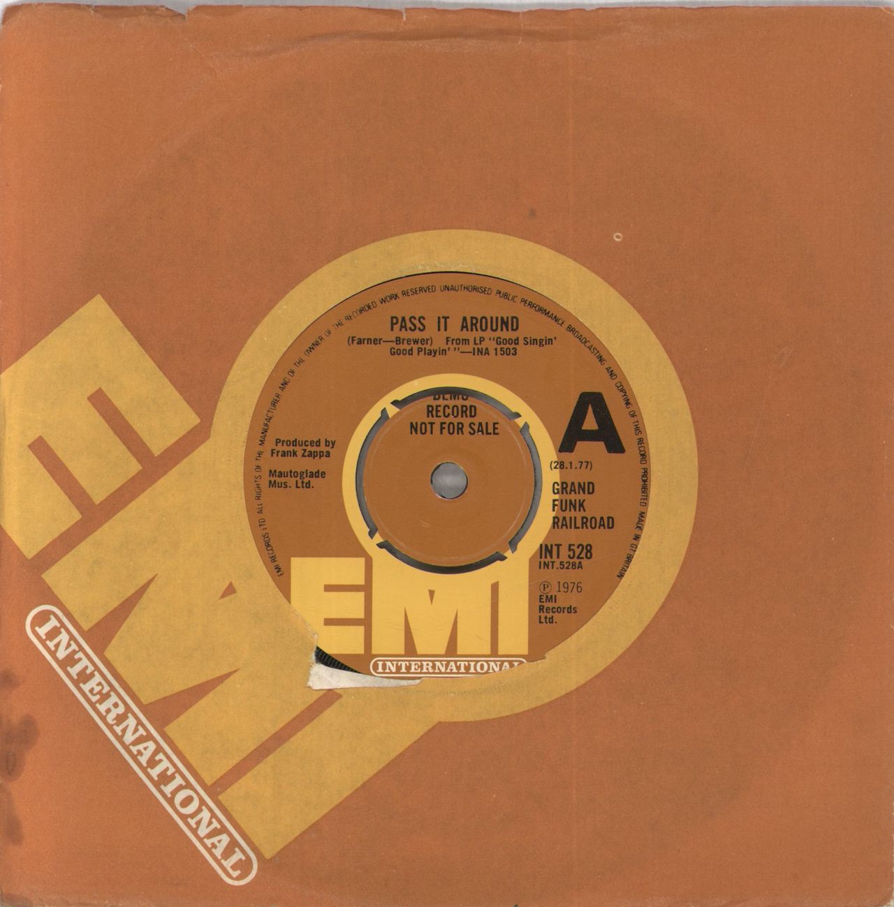 GRAND FUNK RAILROAD Pass It Around (1976 UK 'A' label demonstration vinyl 7" with four-prong centre, includes Don't Let 'Em Take Your Gun, EMI company die-cut sleeve INT528)